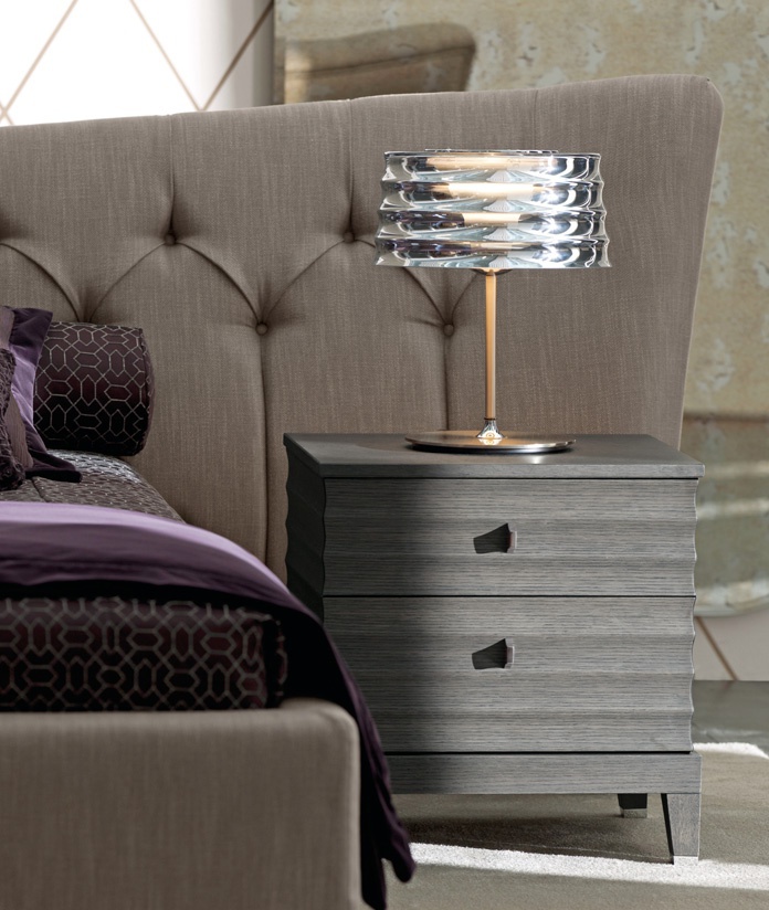 Table Elettra from Italian manufacturer Angelo Cappellini. The body is made from solid oak, the surface is embossed and varnished. Model on legs with two drawers. The metal fittings. A chic choice for the bedroom in a modern or art Deco style.