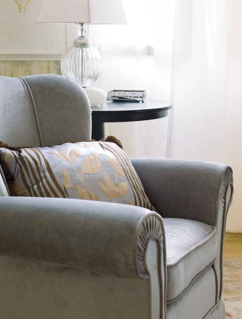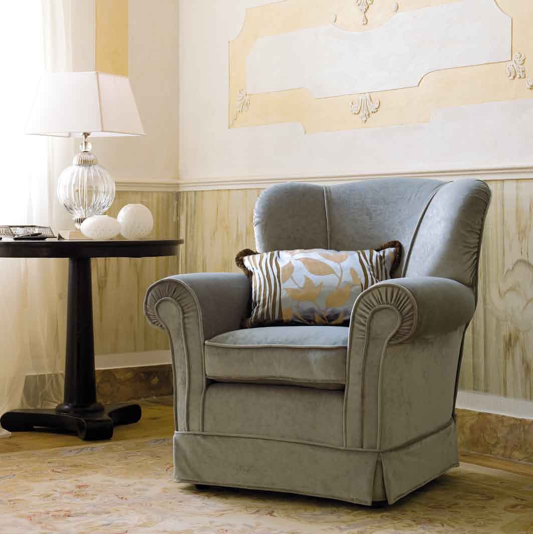 Querinetta chair with a high back Italian producer Ville Venete. Presents a model reclining on a wooden frame, padding with a soft textile. Color in a gray tone. The armrests are rounded off. Excellent solution for classic interior living room.