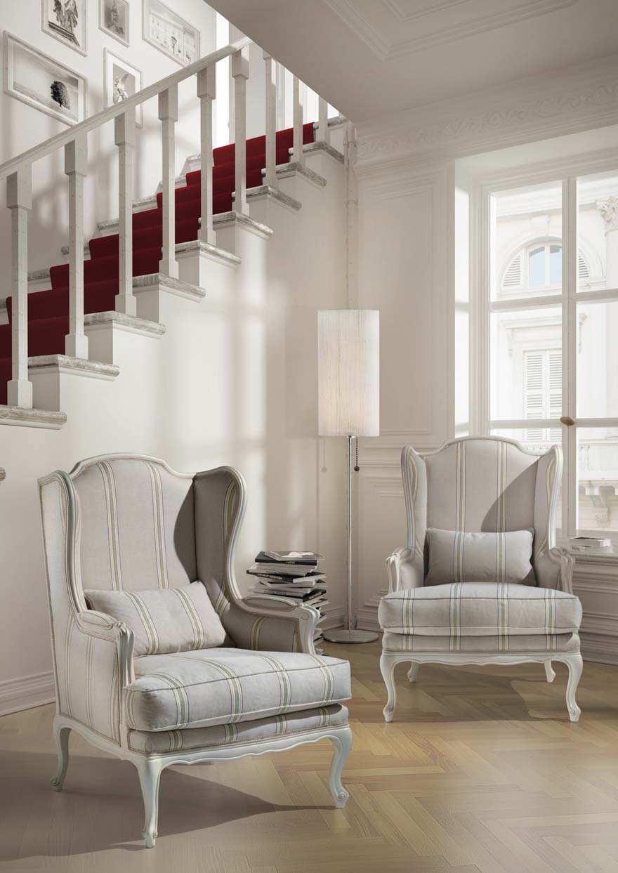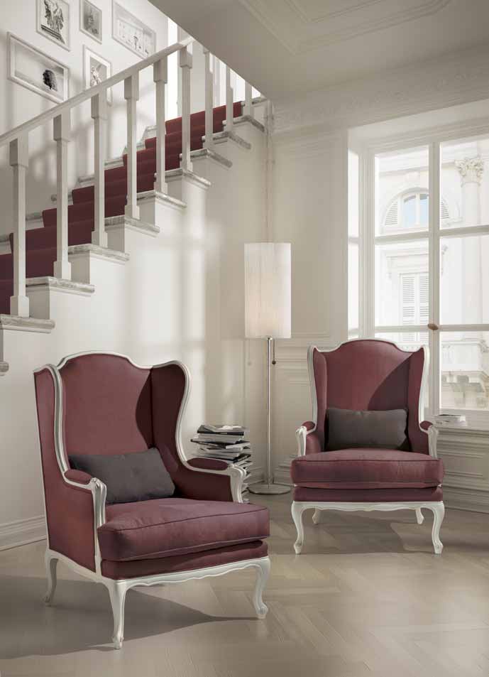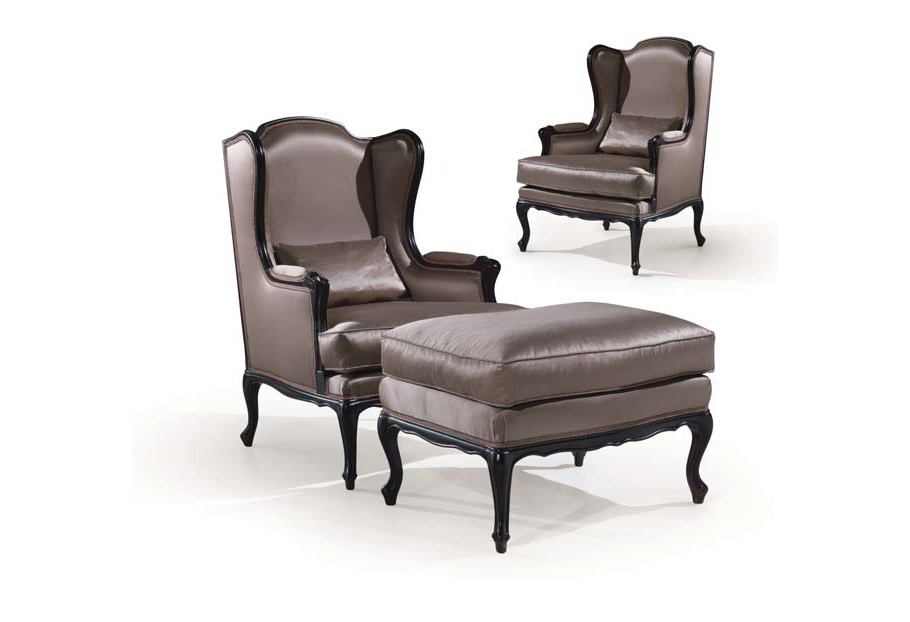 A chair with Ottoman from Mediterraneo Italian manufacturer Angelo Cappellini. Chair with high winged back and comfortable beds in a classic style. The frame is made from wood. Upholstery fabrics from a range of companies. Seat cushion is removable. The ornament serves as a decorative cushion. The varnish finish offered from the company portfolio.