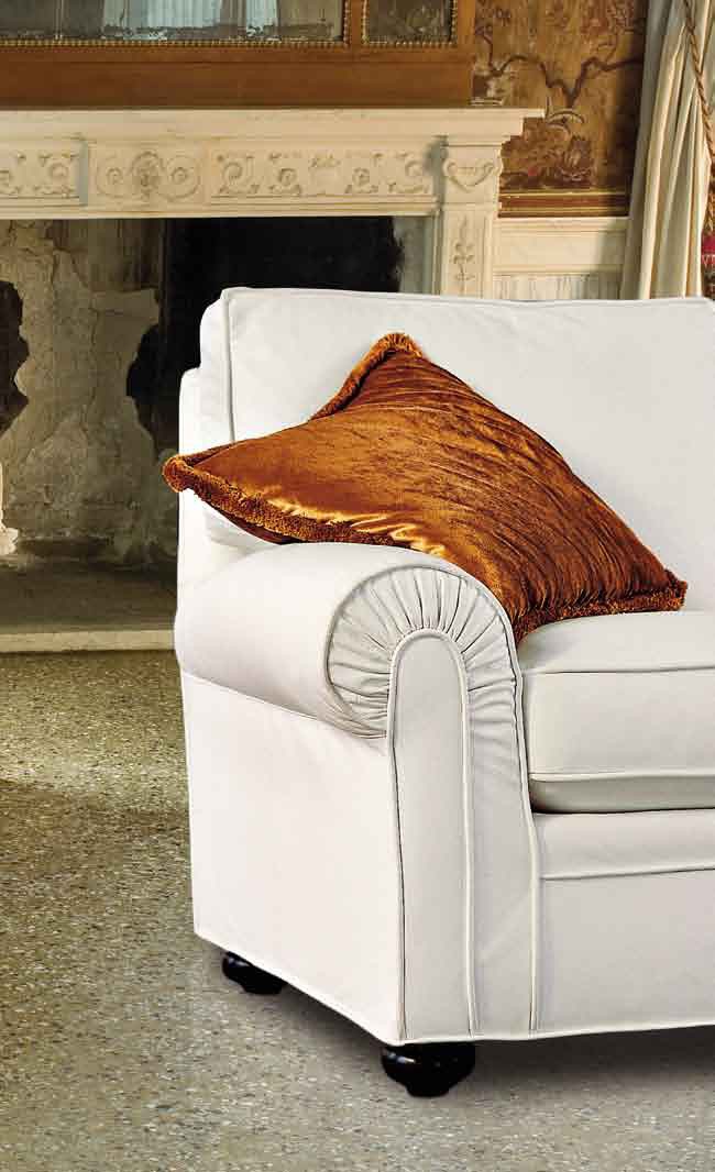 Regina three-seater sofa with removable cushions Italian producer Ville Venete. Sofa on a wooden frame. Upholstery in white textile. Decorative elements serve as accents square pillow in red tones. At the request of the client, the model is complemented by the plates on the arms and the skirt that covers the wooden legs. Modern interpretation of classics,is the perfect solution for interior living room in classical style.