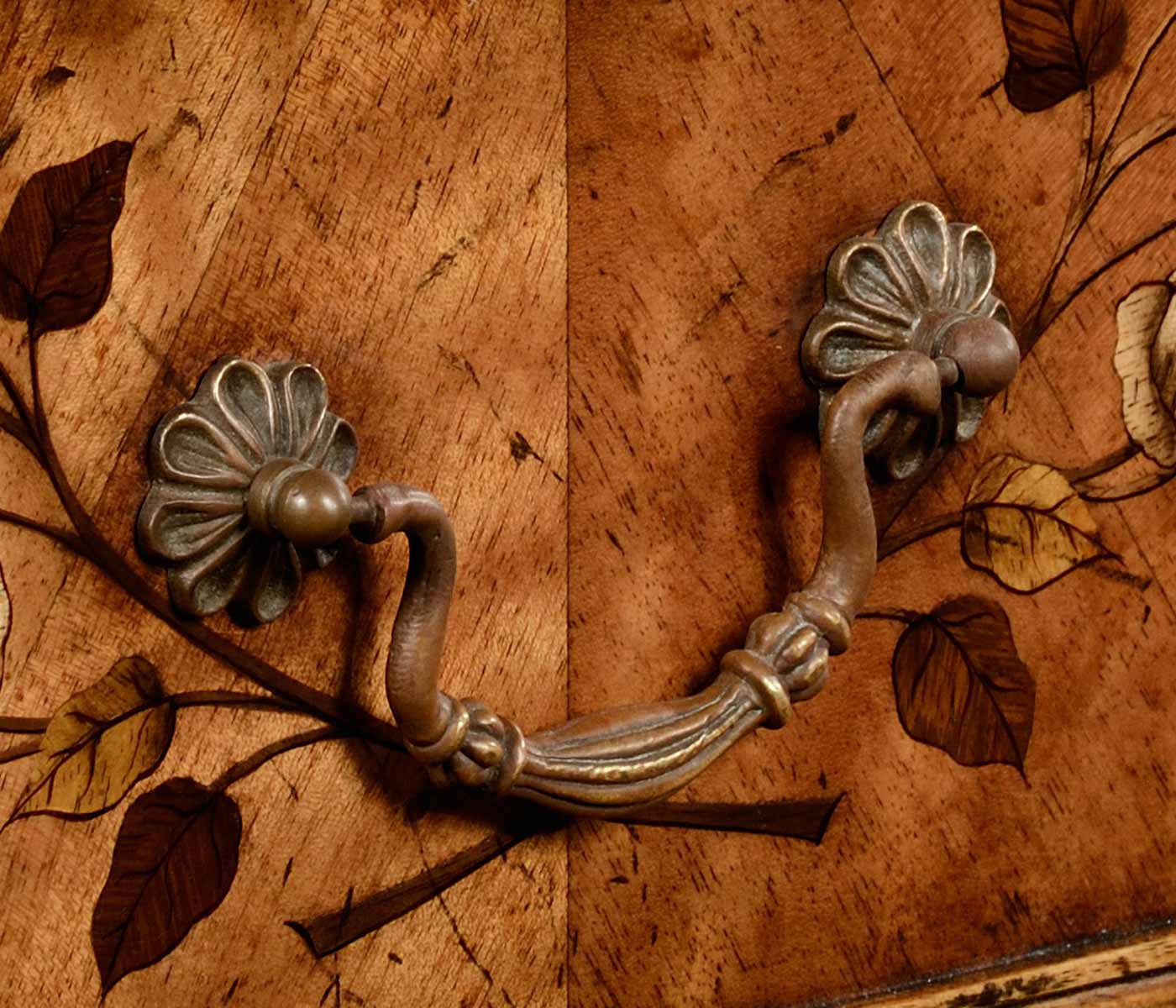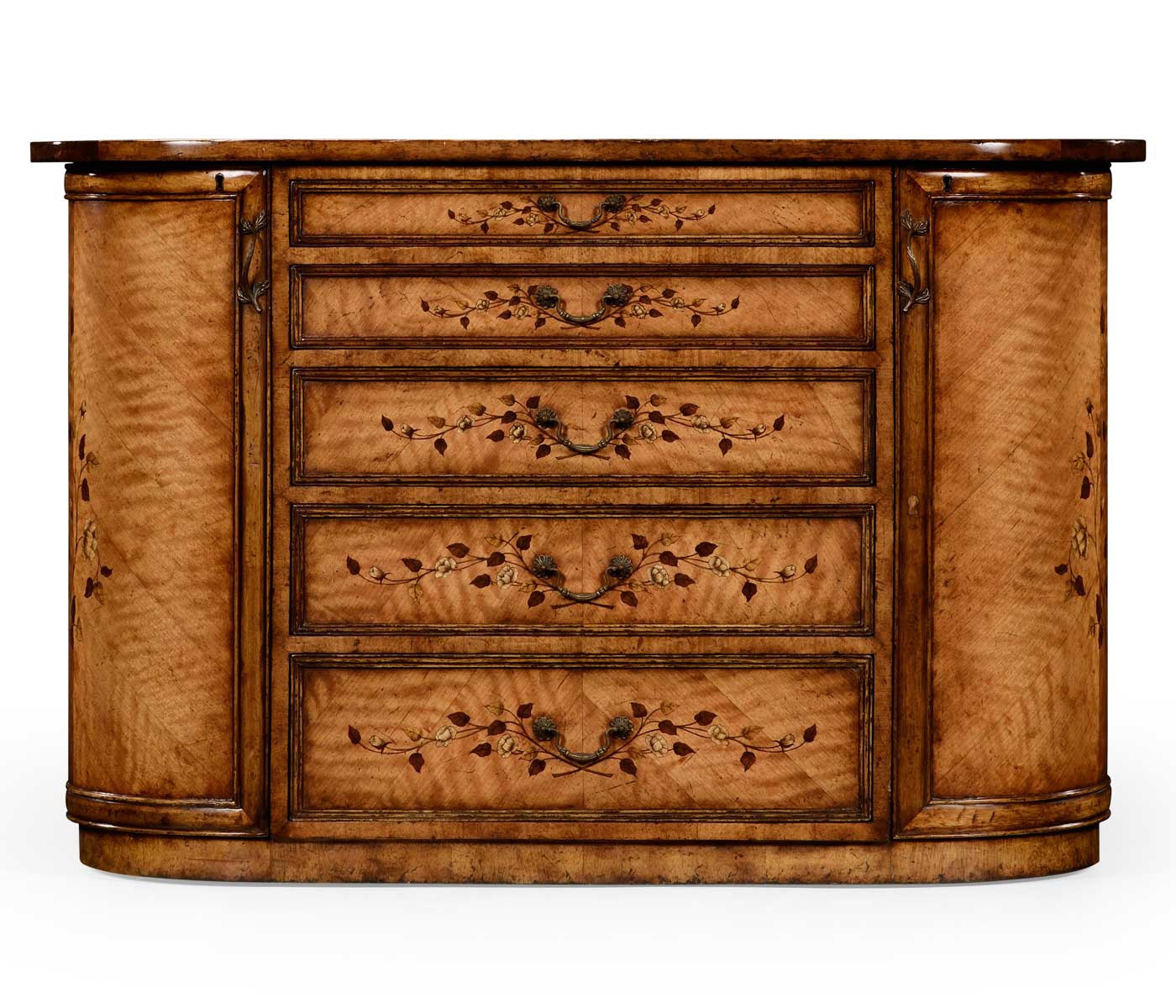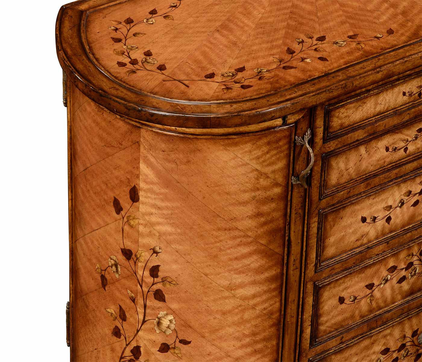 Dresser Art Nouveau from the American manufacturer Jonathan Charles. Practical chest made from natural wood. The case is veneered and decorated with a floral pattern. Handles, knobs and fittings in brass. Model with drawers and doors. Dresser made the designs of the original models in 1900.