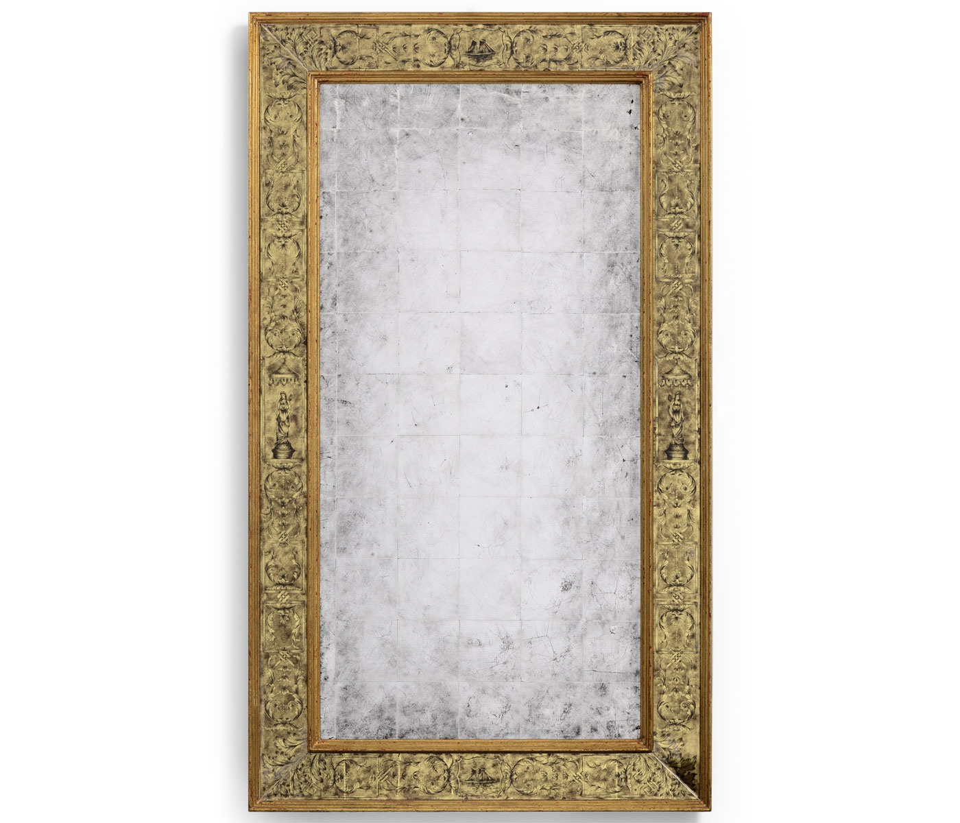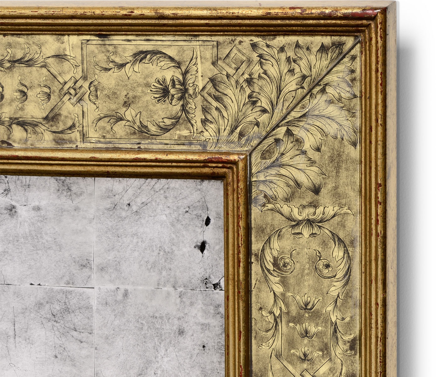 The Buckingham mirror from an American manufacturer Jonathan Charles. Model wall-mounted, rectangular frame with a pattern. The frame is made of wood and covered with gold leaf.