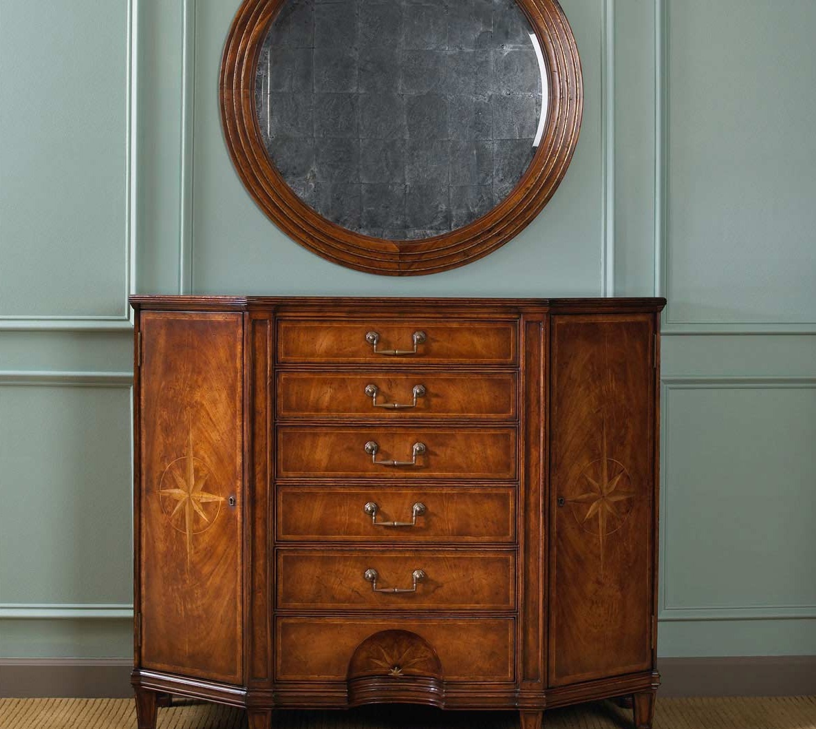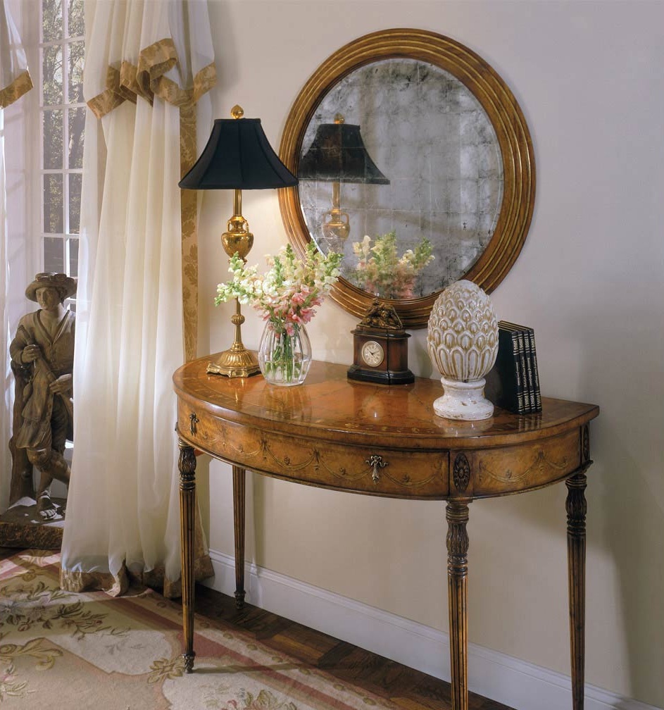 Portobello mirror from an American manufacturer Jonathan Charles. The wall model, round in the frame. The frame is made of wood. The design is executed in classical style.