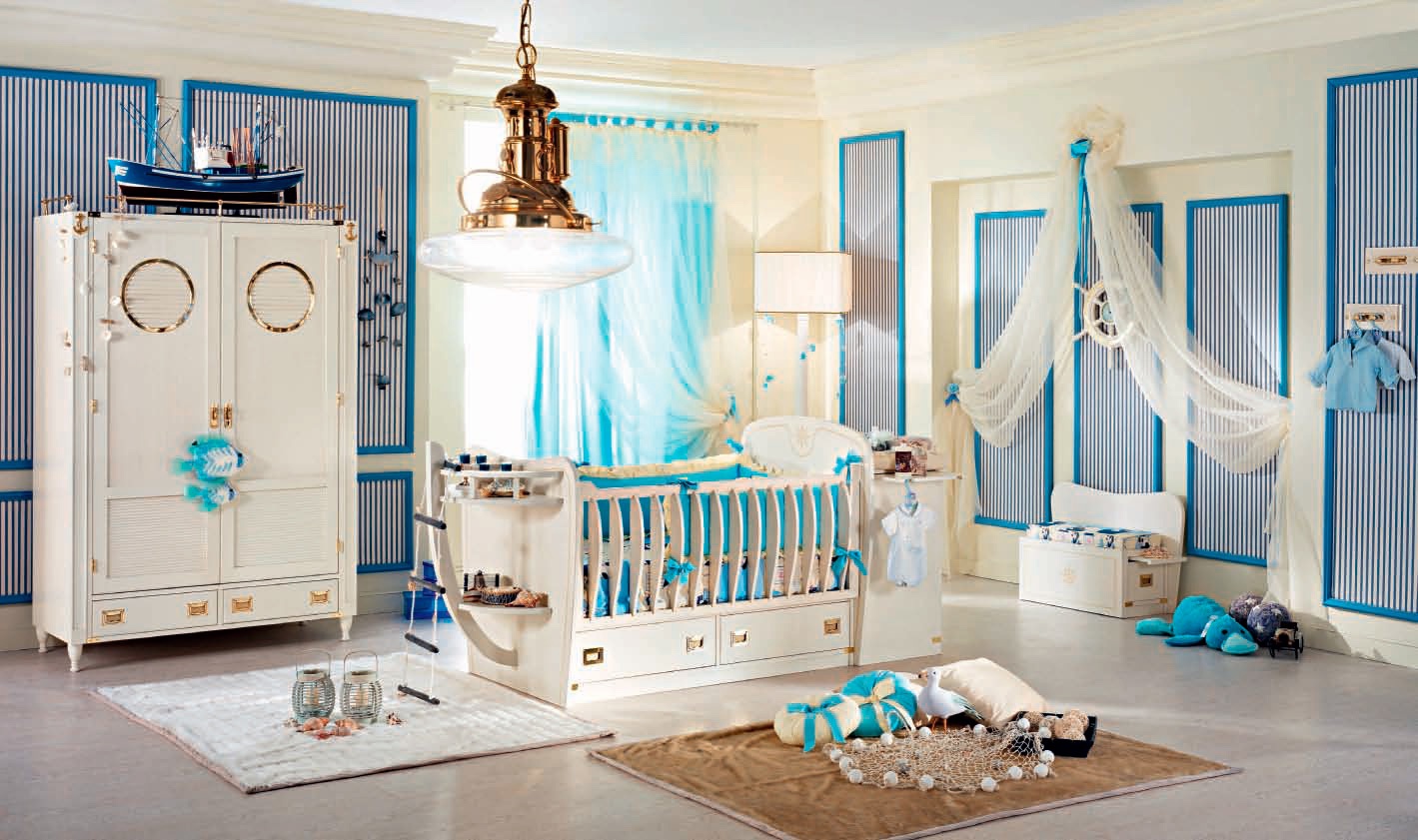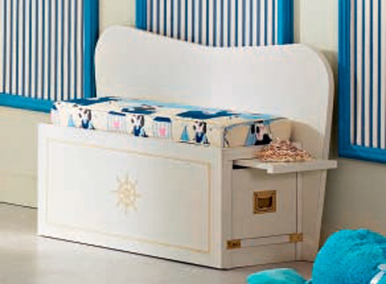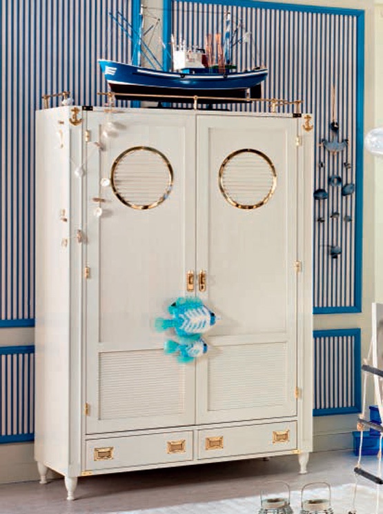 Set for children in a nautical motif Passepartout, Italian manufacturer Caroti. The presented model double Cabinet with double-doors, outside of which image in the form of a window; the sash from the inside covered with a cloth, a chest with a pillow, cot cradle with protective bumpers and changing table - dresser with drawers. The furniture is wooden frame, white lacquer finish greening liquid. A great option for a child's room in a nautical theme.