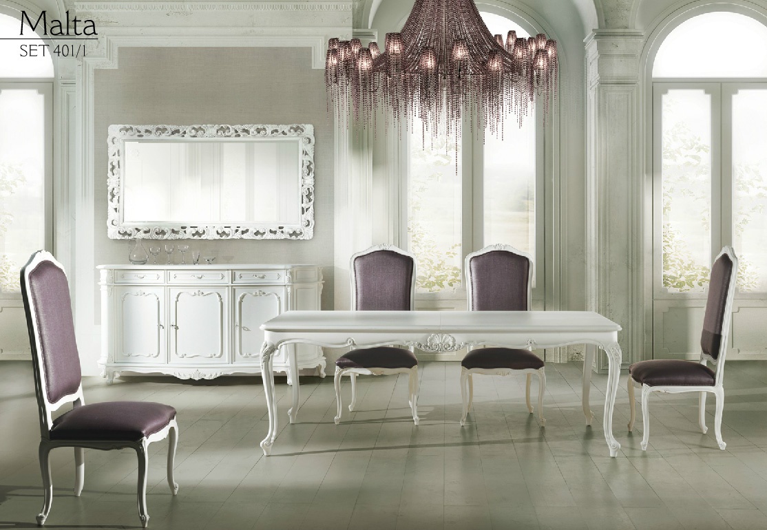 Dining room set for Malta from the Italian manufacturer Angelo Cappellini. Set consists of dining table, sideboard, chairs and mirrors. The rectangular table is made of wood and decorated with handmade carving. Chairs with high back made of wood, and the upholstery is available from textiles. A snack bar is made with three hinged doors and drawers. Figural carved legs. Set complements the large wall mirror of rectangular form, placed in a carved frame. Set is made in a classic style.