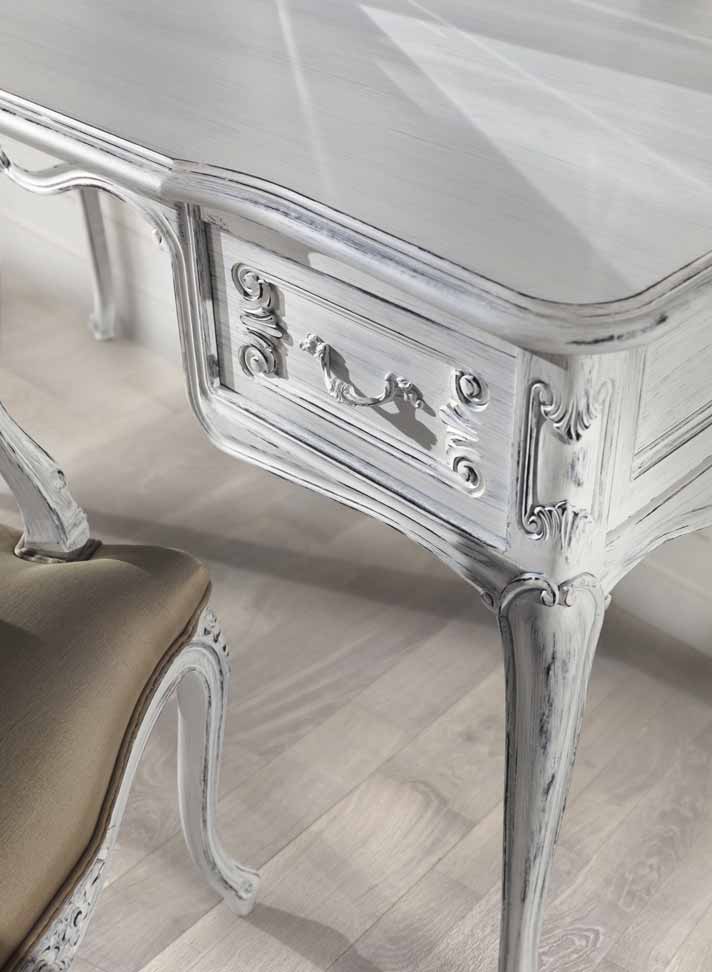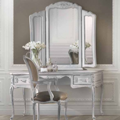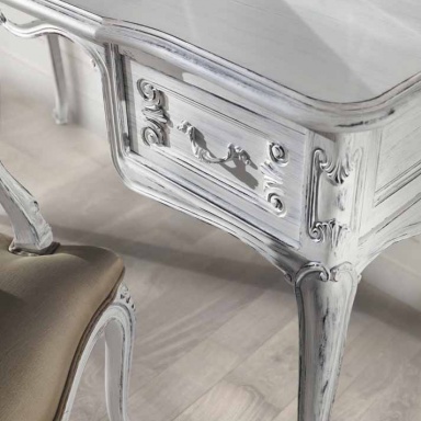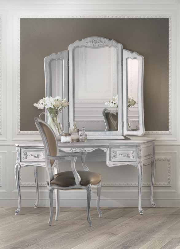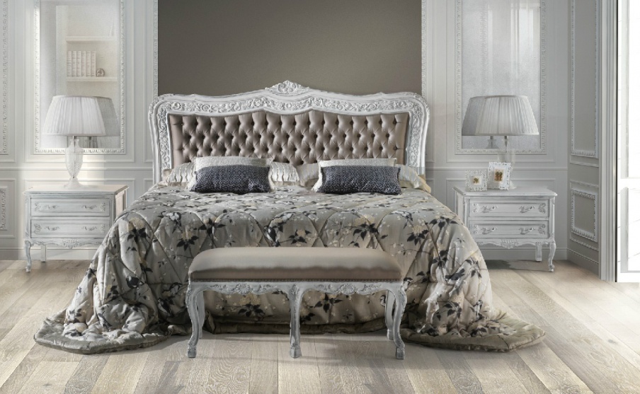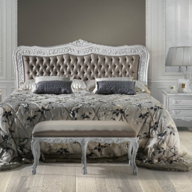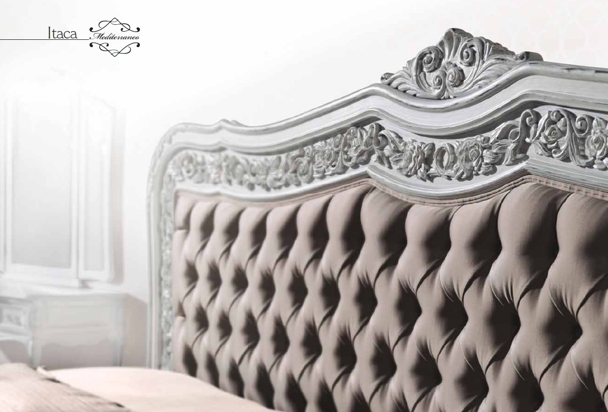 Headsets for Itaca bedrooms from Italian manufacturer Angelo Cappellini. Set includes a double bed, two bedside tables, a dressing table, bench and chair with armrests. Double bed with high headboard. Headboard with quilted upholstery edged carved frame. Tables on figured legs fitted with two drawers. A dressing table is also equipped with drawers and completed with mirror in a frame. Chair with high back and armrests is available in soft upholstery. Furniture for the headset is made of wood and decorated with handmade carving.