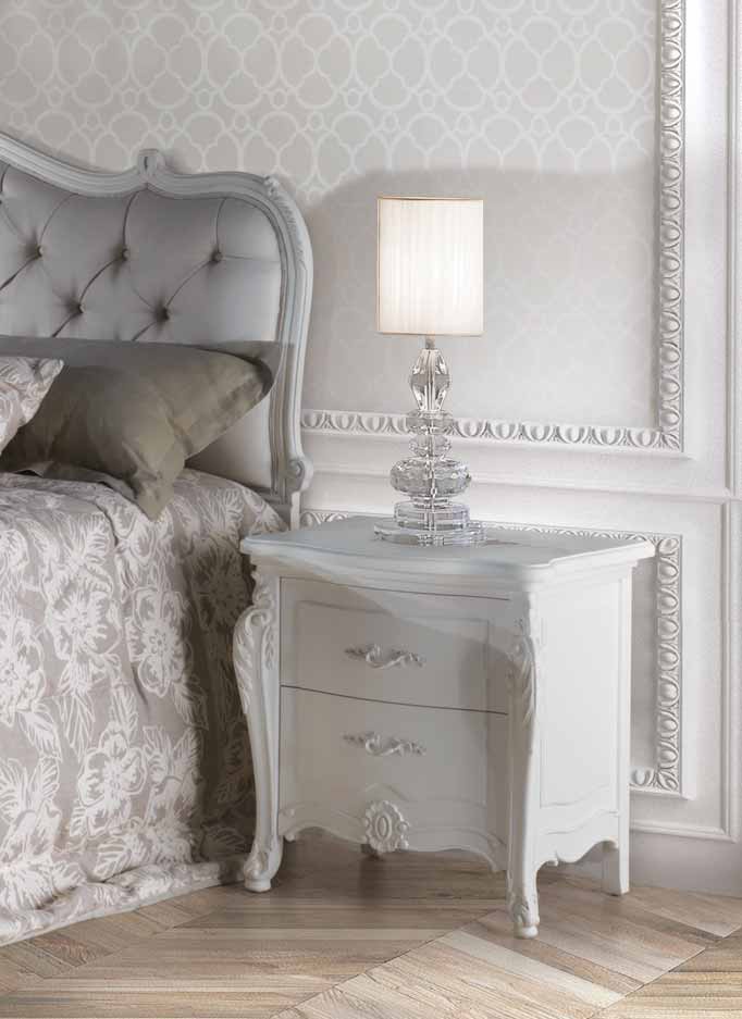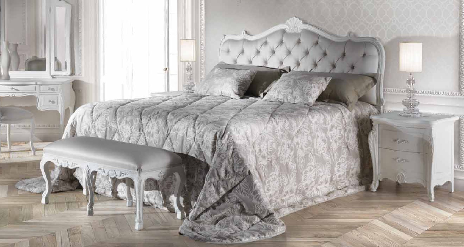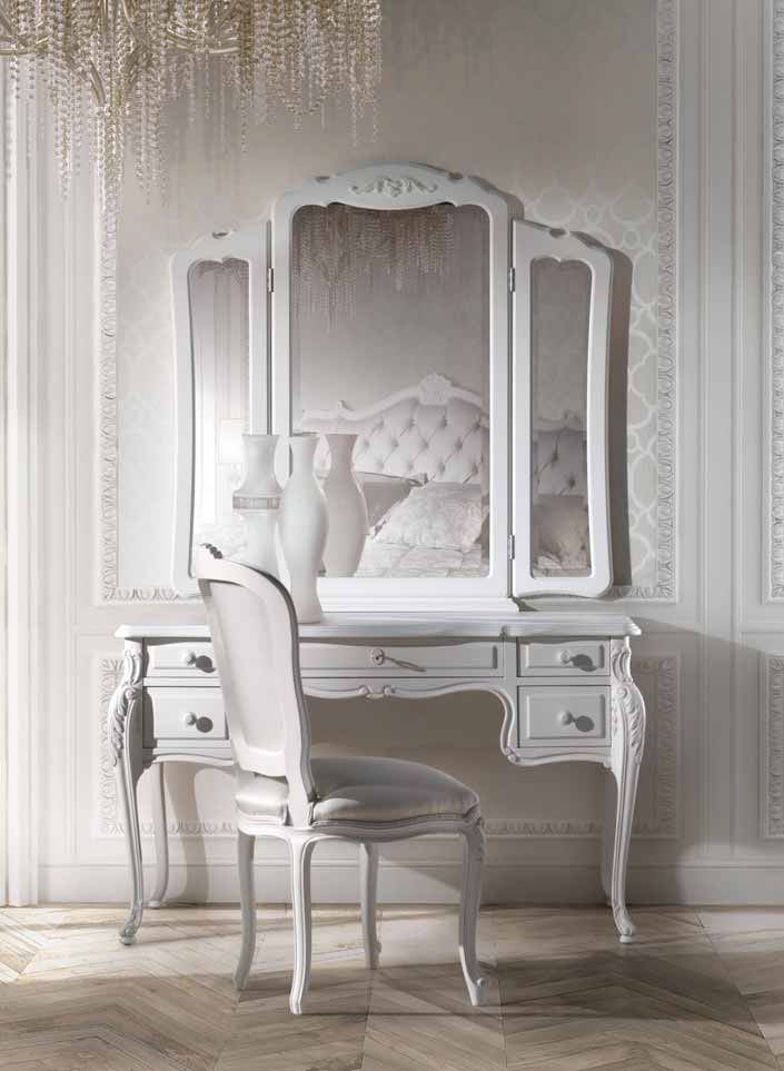 Set for bedroom Ponza from the Italian manufacturer Angelo Cappellini. Set includes double bed, two bedside tables, dressing table, mirror, stool and chair. Double bed with high headboard. Headboard with quilted upholstery edged frame with carved decoration. Bench on six legs and upholstered textiles. Tables on figured legs fitted with two drawers. A dressing table is also equipped with drawers and completed with mirror in a frame. Mirror - tricuspid. Chair with high backrest without armrests is available in soft upholstery. Furniture for the headset is made of wood and decorated with handmade carving. The predominant color is white.