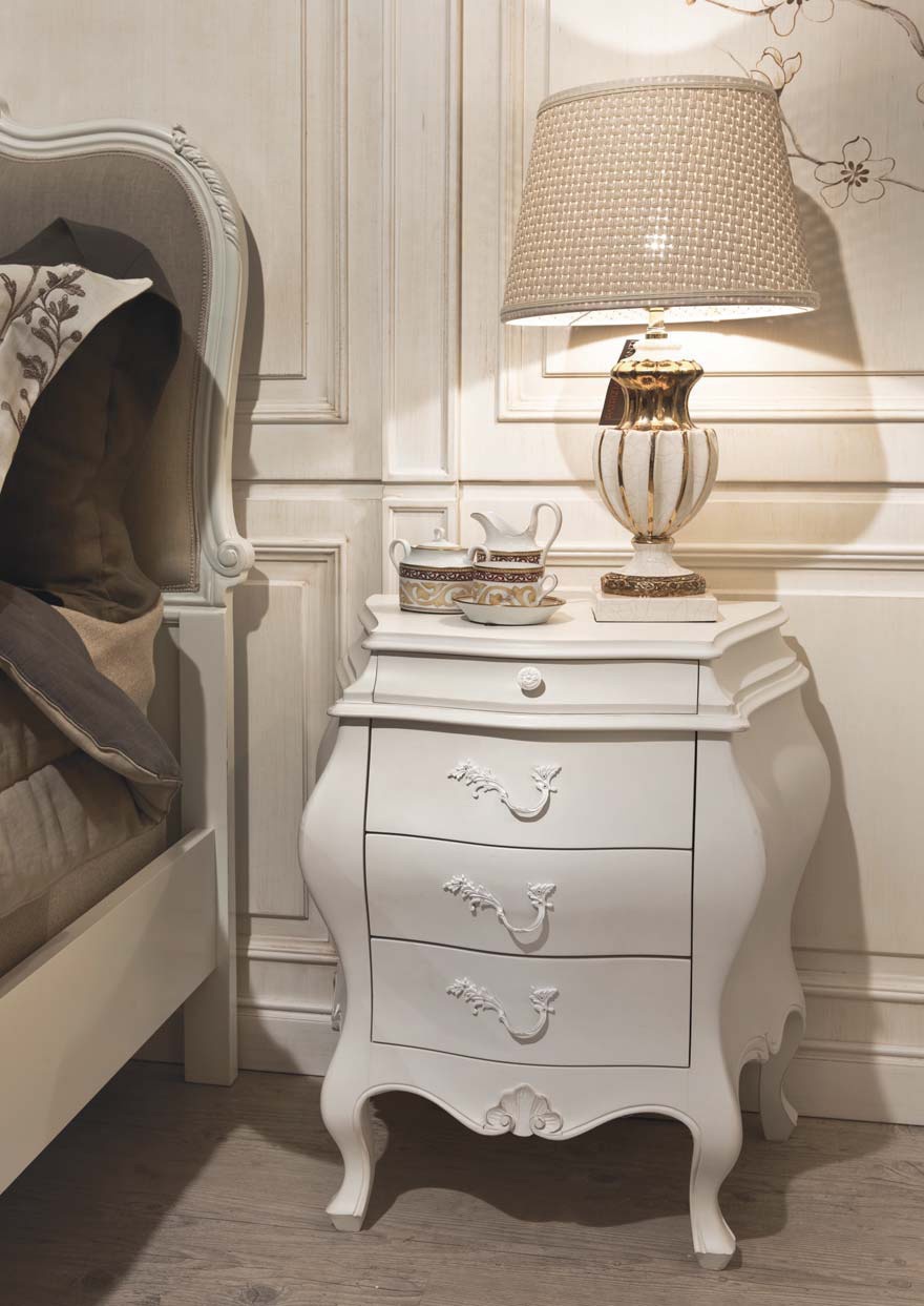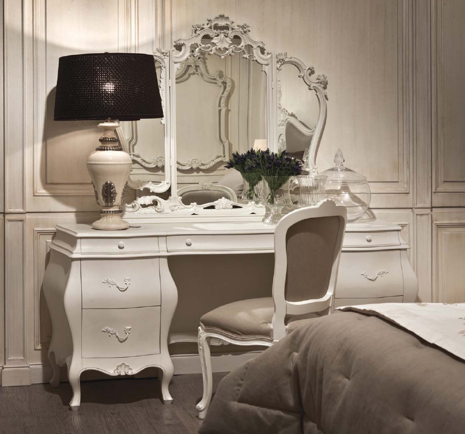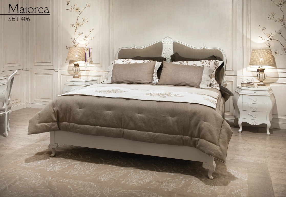 Set for bedroom Maiorca from the Italian manufacturer Angelo Cappellini. Set includes a double bed, two bedside tables, chest of drawers, dressing table, mirror, and chair. Double bed with high headboard. Headboard with upholstery fabric in the frame with carved decoration. A chest of drawers and bedside tables of the original form on figured legs with sliding drawers. A dressing table is also equipped with drawers and completed with mirror in a frame. Mirror - tricuspid. Chair with high backrest without armrests is available in soft upholstery. Furniture for the headset is made of wood and decorated with handmade carving. The predominant color is white.