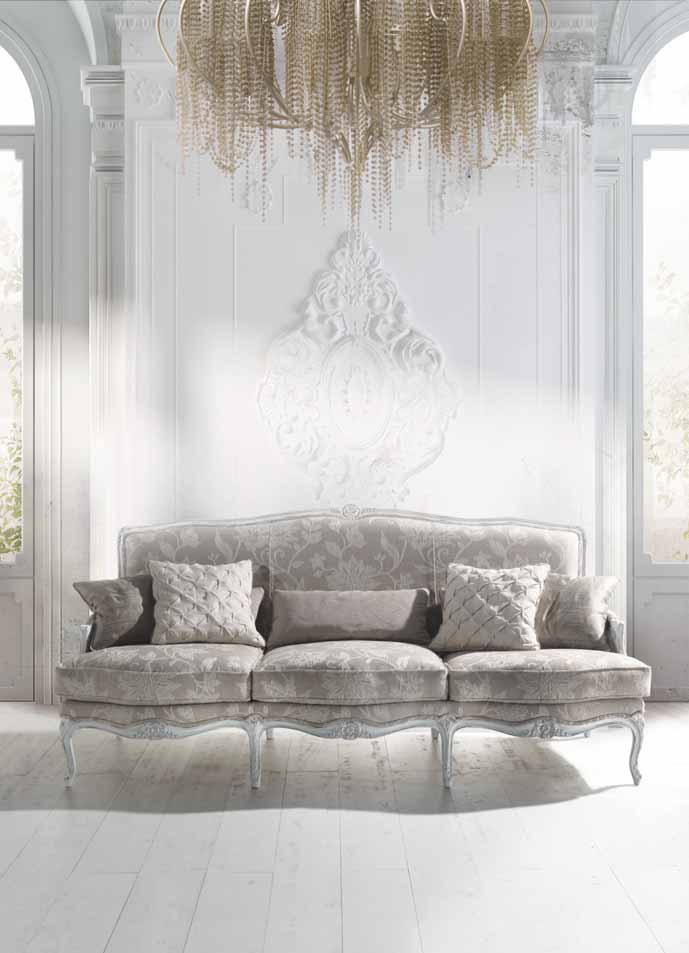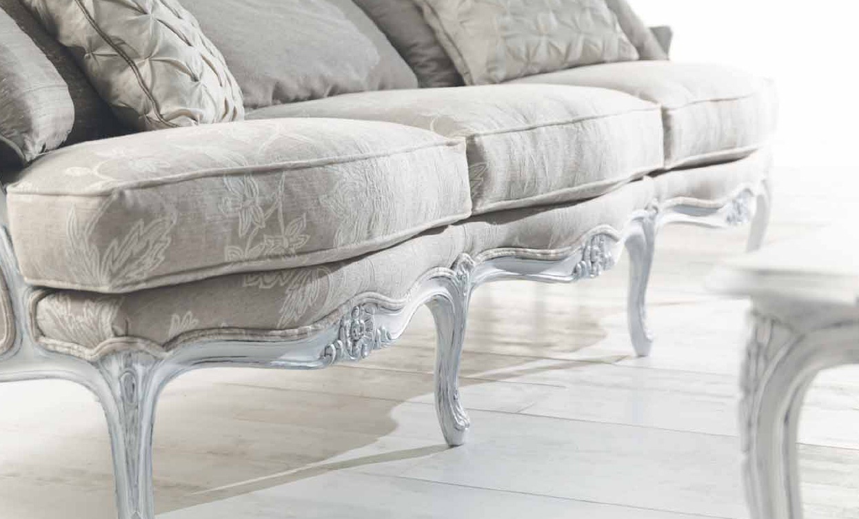Corfu sofa set from the Italian manufacturer Angelo Cappellini. Set includes three seater sofa and an armchair with a high back and small arms. Frame and shaped legs made from wood and varnished. The upholstery is made of textiles, cushions - removable chocks. Decoration are decorative pillows of different sizes and shapes. Coffee tables complement the set. Central table rectangular shape two small pridivannogo table round shape that can be used as coffee, phone and at your discretion. Furniture for the headset is made of wood and decorated with handmade carving.