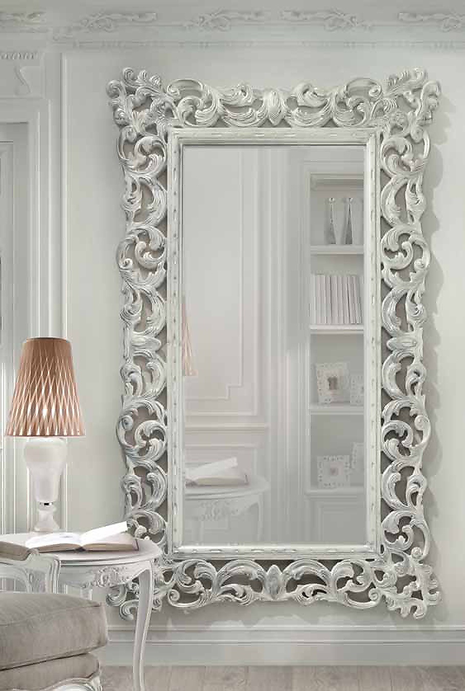 The mirror Mediterraneo from the Italian manufacturer Angelo Cappellini. Wall mirror, rectangular shape, framed. The carved frame is made of wood and lacquered from a range of companies. A great choice for the interior in classic style.