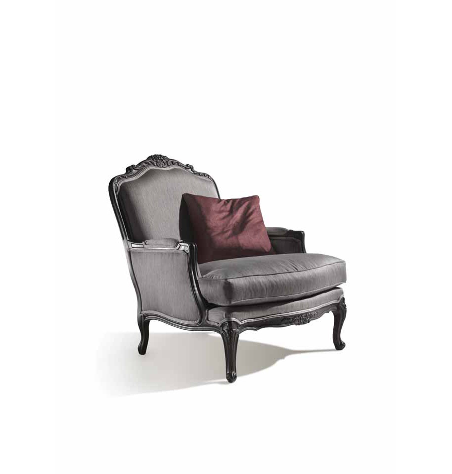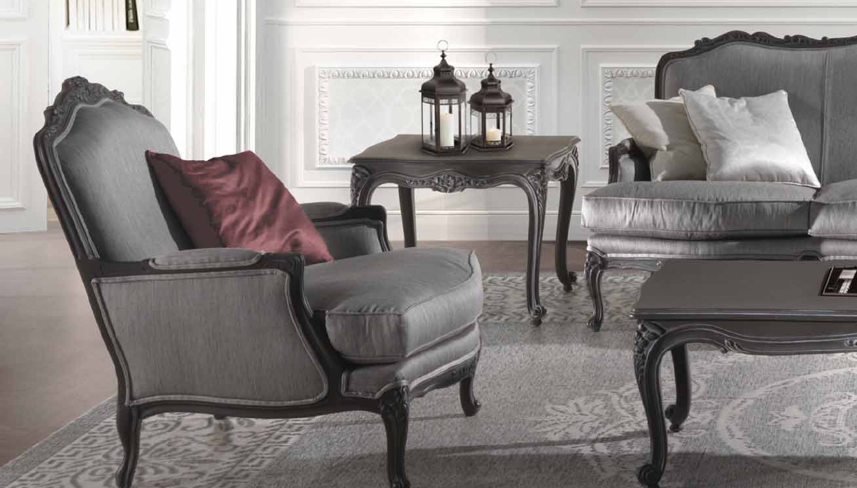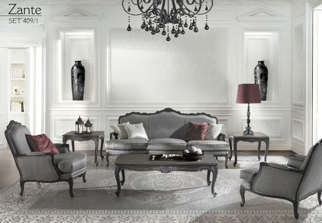 Zante sofa set from the Italian manufacturer Angelo Cappellini. Set includes three seater sofa and chair with low armrests. Frame and shaped legs made from wood and varnished. Upholstery textile, seat cushion is removable. Decoration are decorative pillows. Complement set Central table rectangular shape two small square tables on the sides that you can use as coffee, coffee, telephone and at your discretion. Furniture for the headset is made of wood and decorated with handmade carving. The dark grey finish is offered with a varnish.