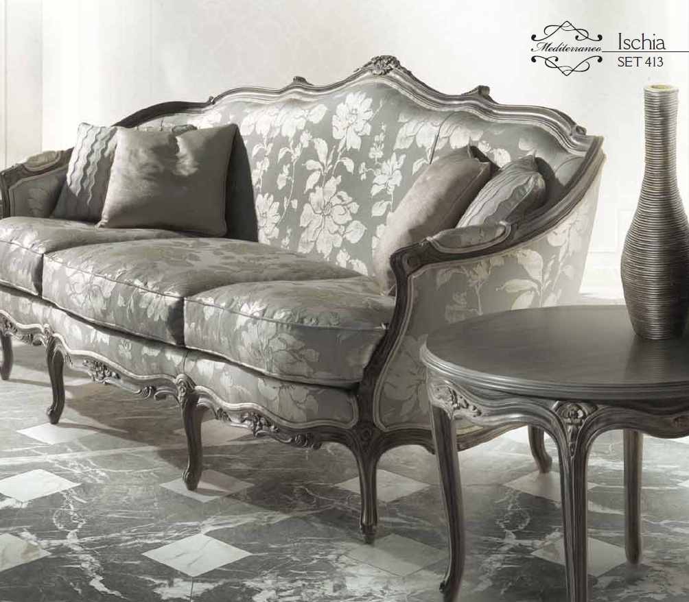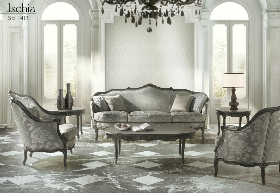 Sofa set from Ischia Italian manufacturer Angelo Cappellini. Set includes three seater sofa and armchairs with shaped backs in the frame. The seat cushion is removable. The upholstery is made of textile. Decoration are decorative cushions. Complement a table set Central oval and two small round tables that you can use as coffee, coffee, telephone and at your discretion. All the items of furniture for the headset is made of wood and decorated with handmade carving. Finishing made with lacquer.