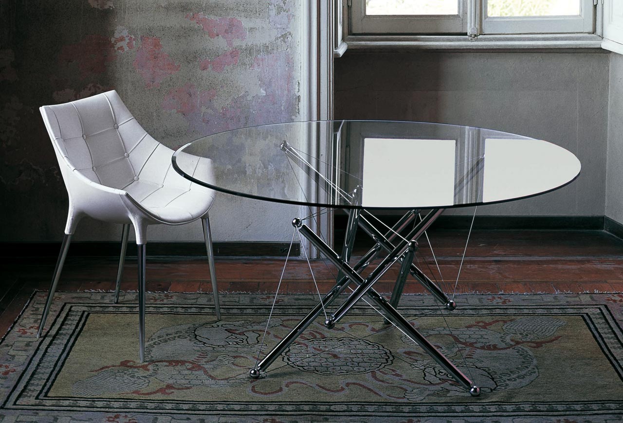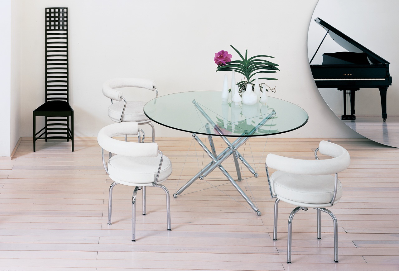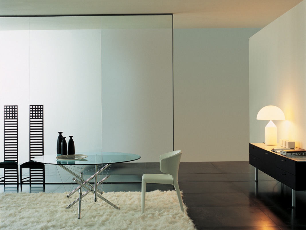Table round dining 713/714 from the Italian manufacturer Cassina. Design table designed by Theodore Waddell. The frame is made of steel with chrome surface. The tabletop is made of tempered glass. Perfectly fits in any modern interior.
