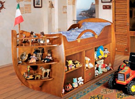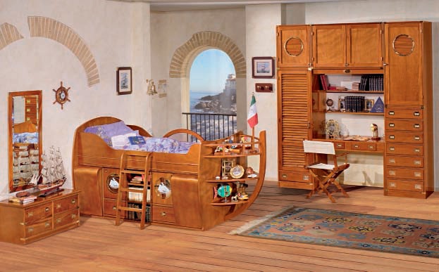 Set for children's Capitano, an Italian manufacturer of Caroti. The presented model of the crib in the form of a ship with the captain's bridge, fitted with shelves and drawers, dresser with mirror, locker with built-in table for your computer. Furniture made of genuine mahogany, decorated with brass elements. Design solution for interior of child room in a nautical theme.