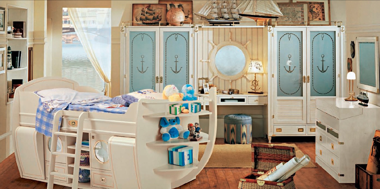 Set for children's Capitano Italian manufacturer Caroti. The presented model of a cot in the bridge, ladder, drawers and compartments for storage, a Cabinet with stained glass with built-in table for computer and a chest of drawers, with hinged lid. Furniture made from solid wood, finish greening liquid varnish, fittings made of brass. Design solution for classic children room in marine style.