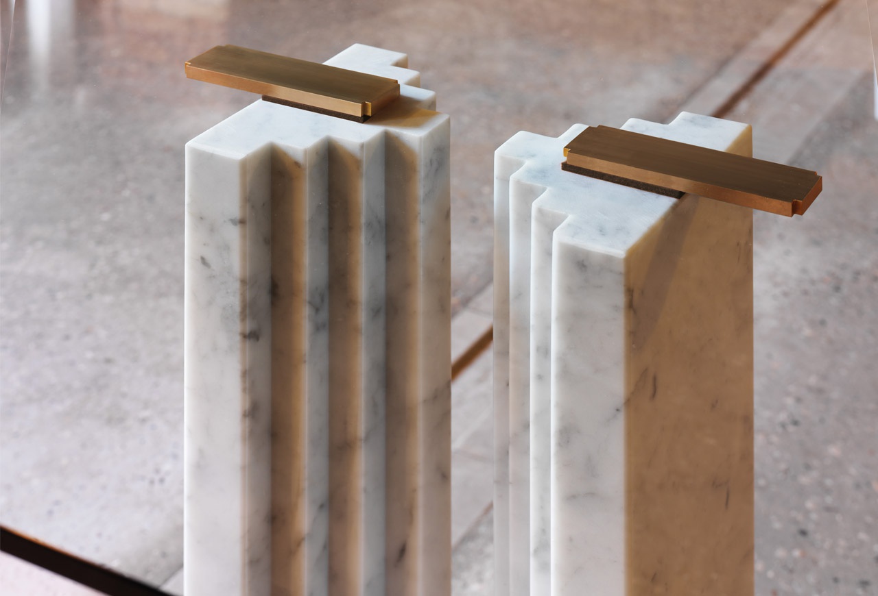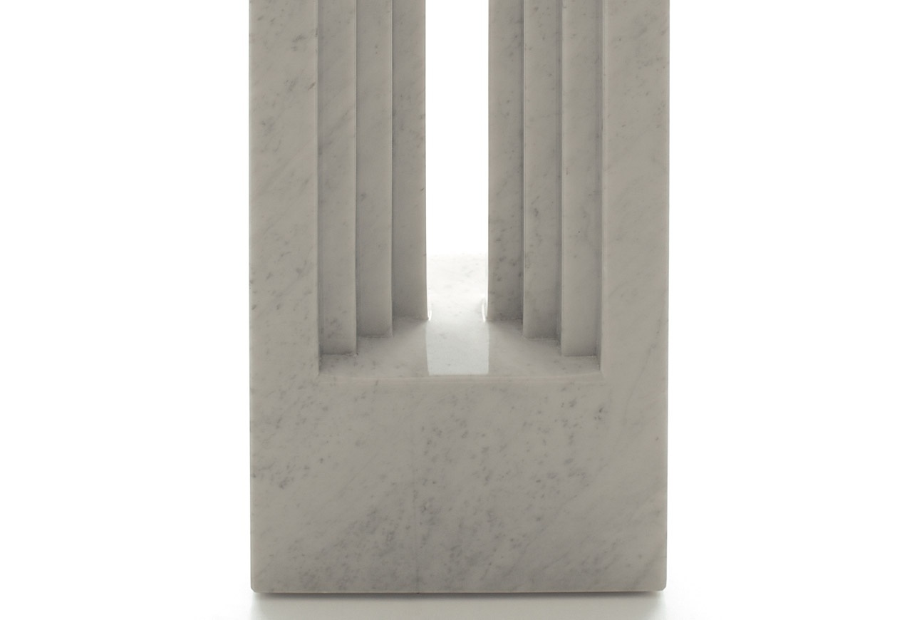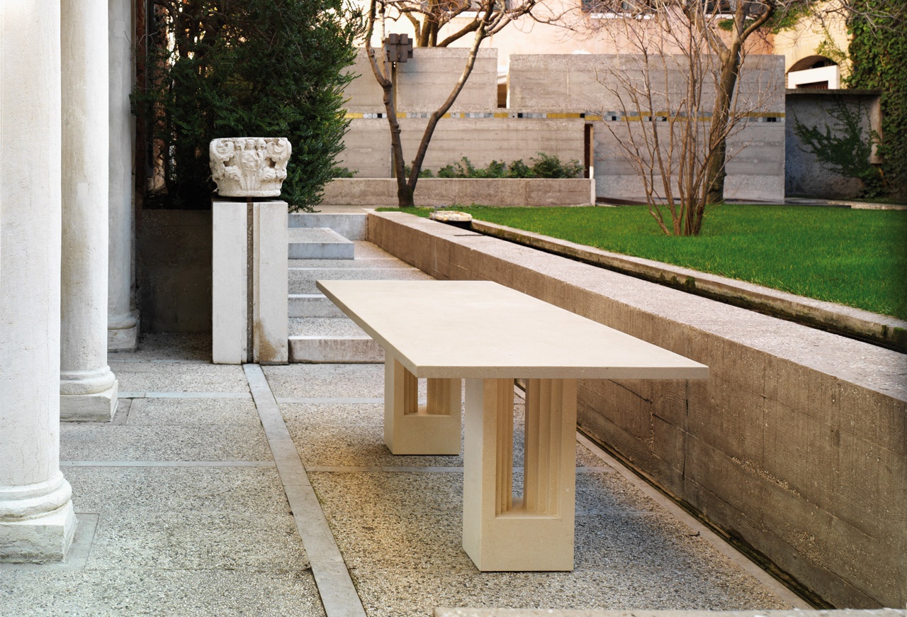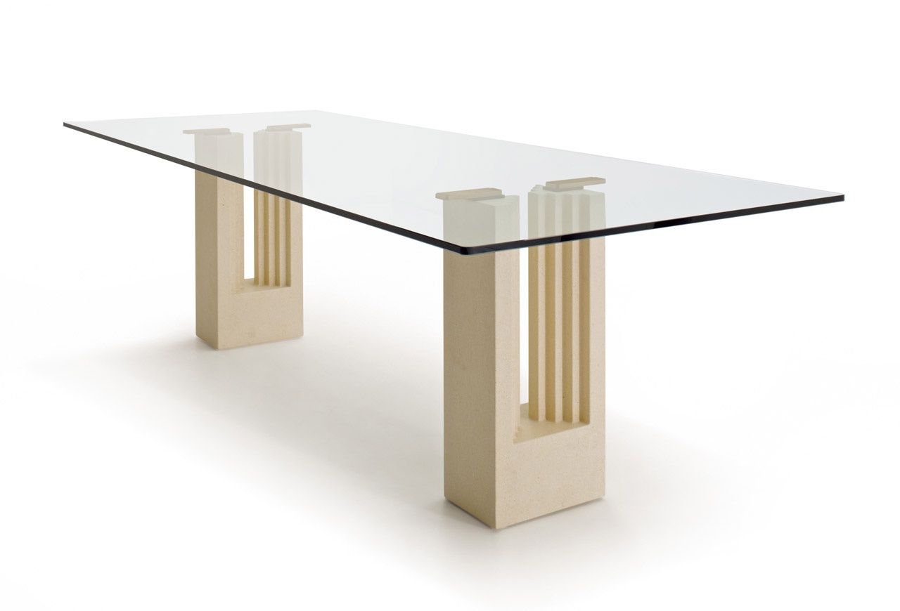 Delfi rectangular table from the Italian manufacturer Cassina. A frame made of two monolithic pillars with the countertop. It is made of marble of white, black, or white stone. Top of marble, stone or glass. Fittings - brass. The table is a revision of the rational revision of the traditions of the 1930s. Colors range from the manufacturer.