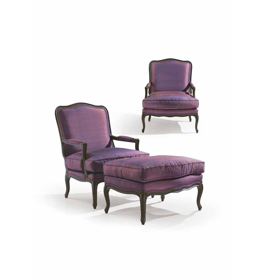 A chair with Ottoman from Mediterraneo Italian manufacturer Angelo Cappellini. Model on a frame of wood. Decoration is the carving. The varnish finish offered from the assortment. The seat cushion is removable. Upholstery textiles. The color and texture of upholstery to choose from for the company directory.