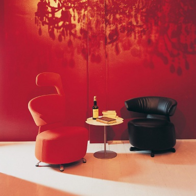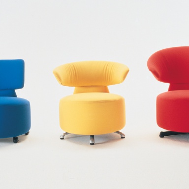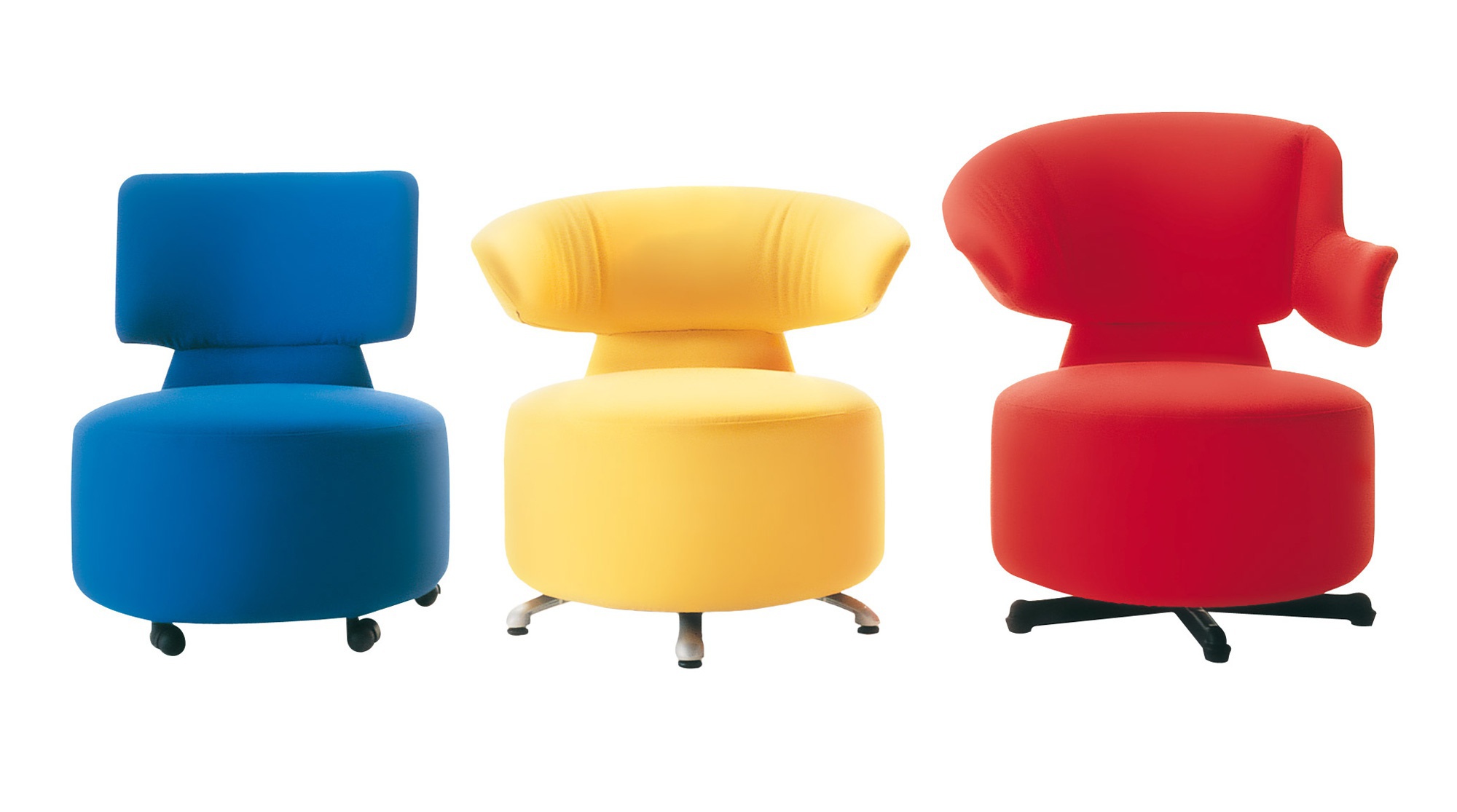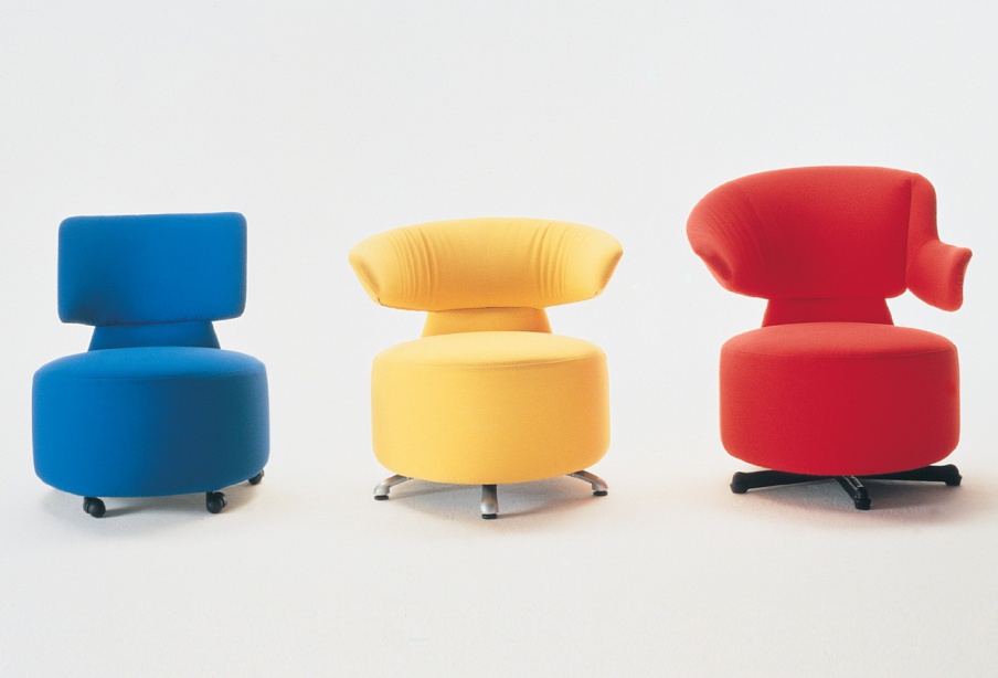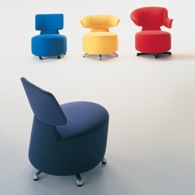 Chairs K06 AKI BIKI CANTA by Italian manufacturer Cassina. Model on fixed steel base with aluminum fittings. Available also on black castors. The chair consists of a backrest with armrests with variable shape, which can be used as headrests. A steel frame. Filling - polyurethane foam and polyester/wool. Removable upholstery in fabric or leather. Colors range from the manufacturer.