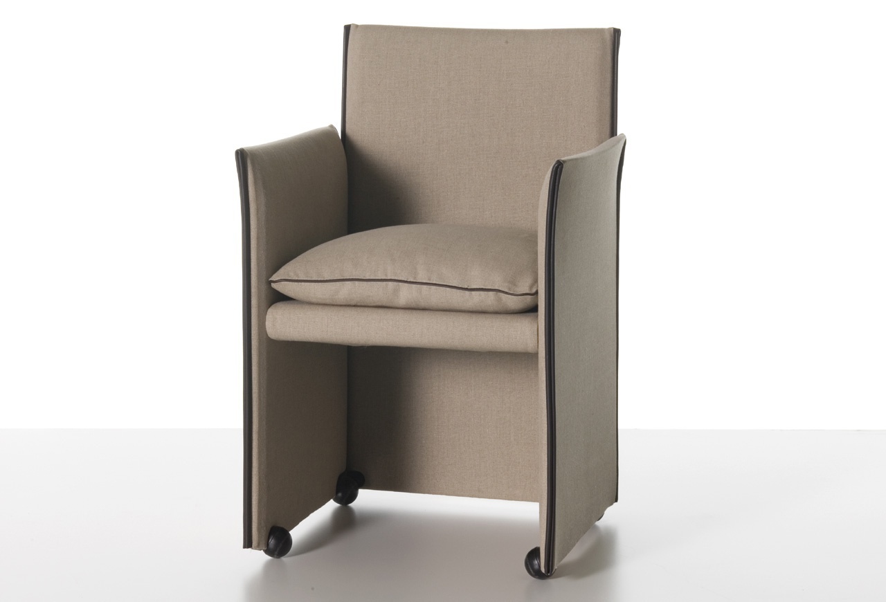 401 BREAK a chair on a metal frame from the Italian manufacturer Cassina. Made with a frame made of plywood panels with steel skeleton. Fabric upholstery or leather. Removable upholstery with stitched zippers. Seat cushion filled with foam and feathers. Feet from black plastic material. Also available with rollers in assorted colors.