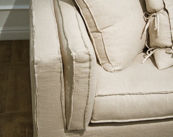 Two-seater sofa with removable cushions Landscape of the Italian producer Ville Venete. Padding soft textile in a light tone. Frame of sofa made of natural wood. Shape sofa rectangular, semi-circular armrests. Back models soft. Design solution for modern interior living room.