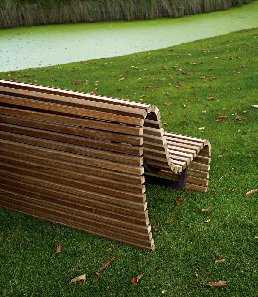 The Titikaka bench for garden and terraces from the Italian manufacturer B&B Italia, designer Naoto Fokasawa. Frame - aluminum, seat and backrest - wood. Colours in stock.