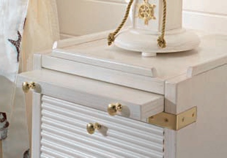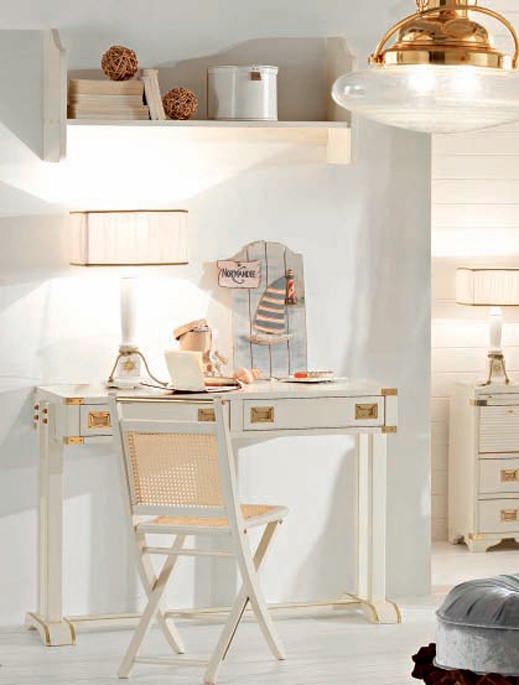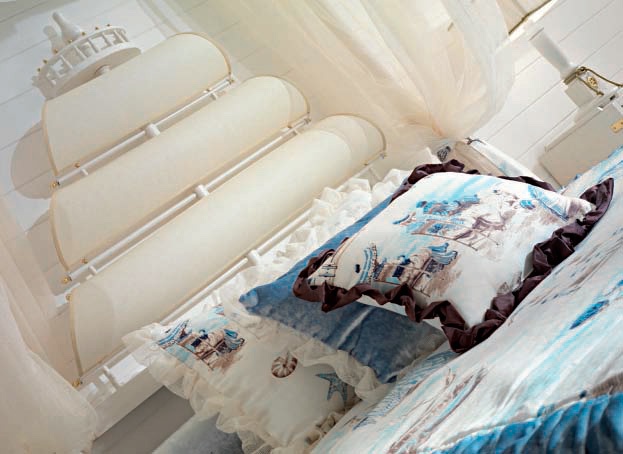 Headsets for The Princess'child s bedroom Italian manufacturer Caroti. This headset presents the model of the bed with sail headboard, canopy textiles, bedside tables, a writing table with brass accents, chair of the Vienna straw with brass inserts and poof, decorated cloth. Furniture made from solid wood, finishing in white lacquer greening liquid. Design solution for interior of a bedroom of your little Princess in a nautical motif.