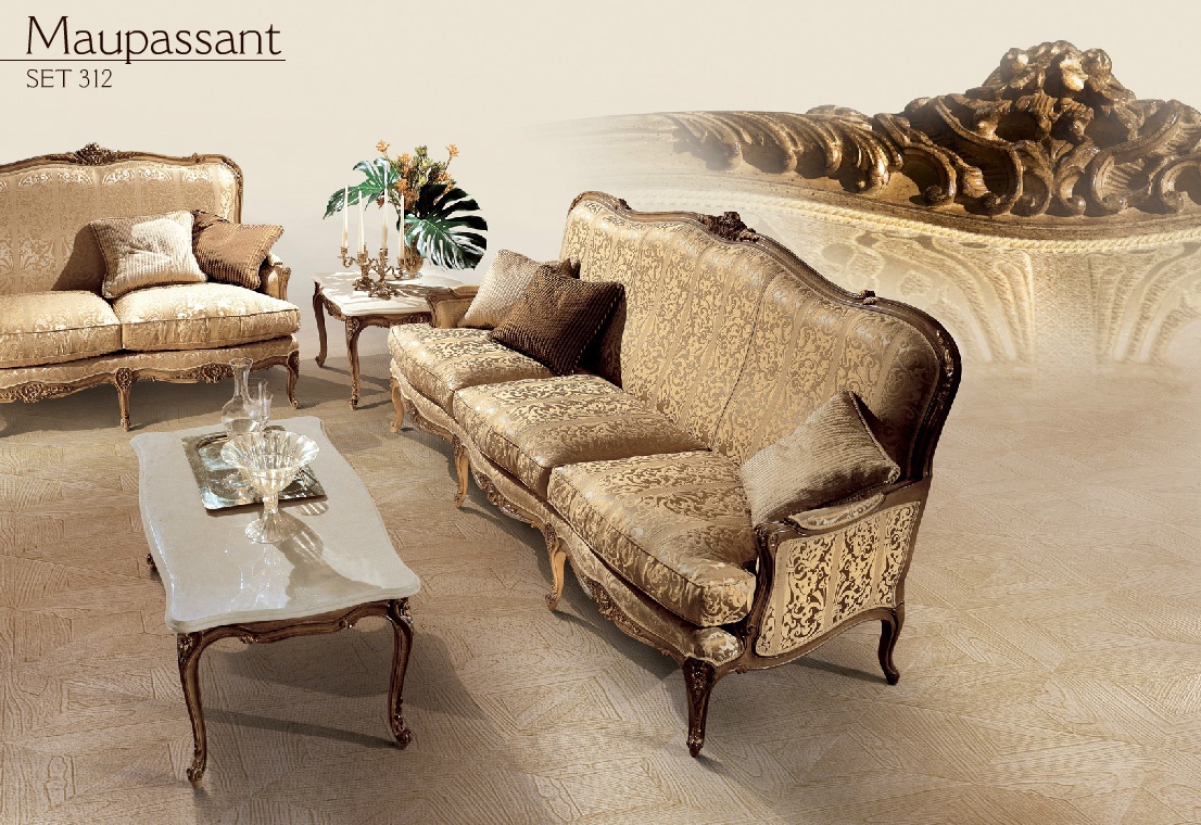 Maupassant three seater sofa from Italian manufacturer Angelo Cappellini. Model with a high back. The frame and legs are made of wood and decorated with carved handmade decor. The varnish finish offered. Upholstery textile to choose from a range of companies. The armrests are complemented with soft pads. Decor - hand carved.