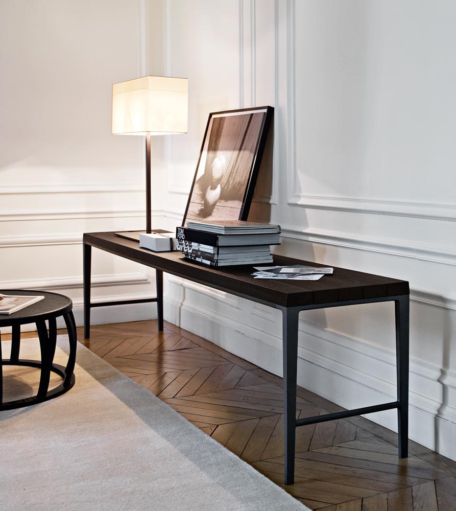 The Antares console from the Italian manufacturer B&B Italia. Design Antonio Citterio. Top: solid wood in veneer oak. Base frame made of painted cast aluminum. Colors in stock