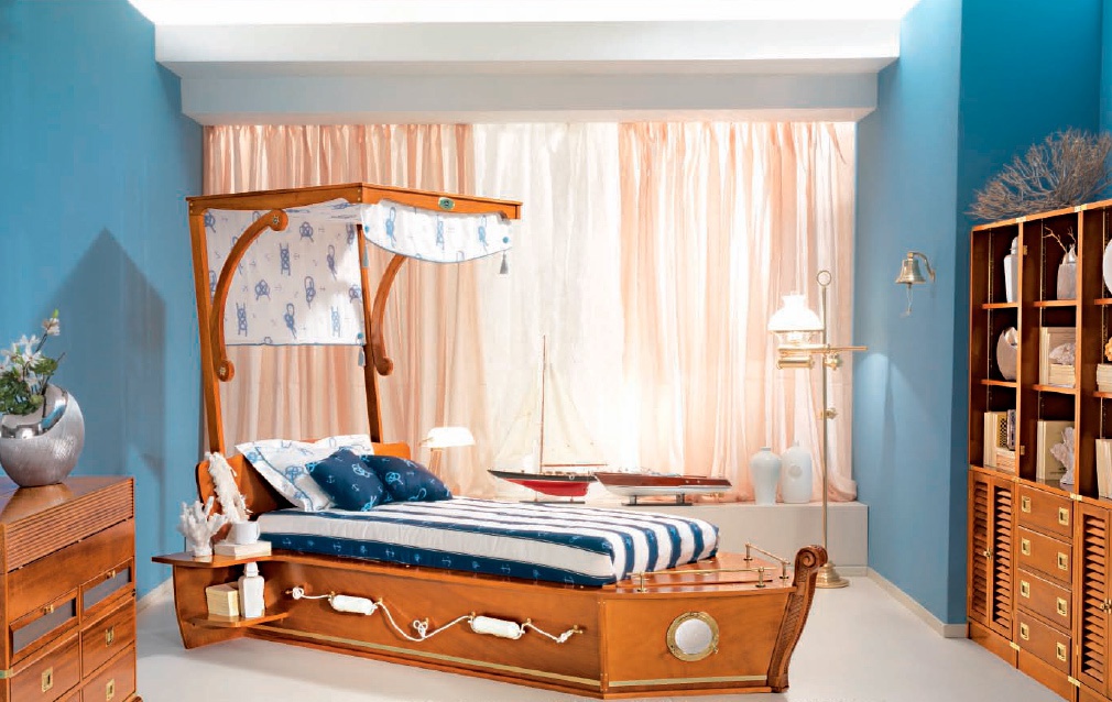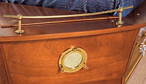 Children (Suite for children) Calafuria, an Italian manufacturer of Caroti. Presents a model of the bed on a wooden frame with lifting mechanism and a canopy, made of genuine mahogany, parts made from brass in the shape of a porthole, the functional use of all spaces, as in best Maritime traditions. Cabinet with hinged doors-shutters and drawers. The design for the classic children's room.