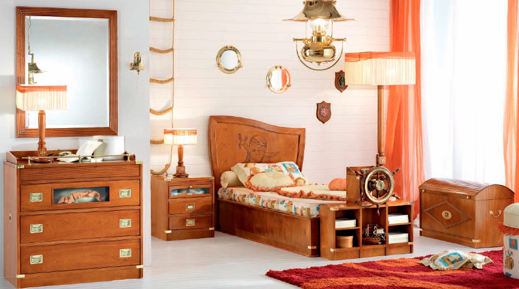 Set for children's Pirata, an Italian manufacturer of Caroti. The presented model teenage bed with the image of a pirate, chest of drawers and bedside tables. Built at the foot of the low rack with the steering wheel. Furniture made of genuine mahogany. The perfect solution for classic baby room with nautical motifs.