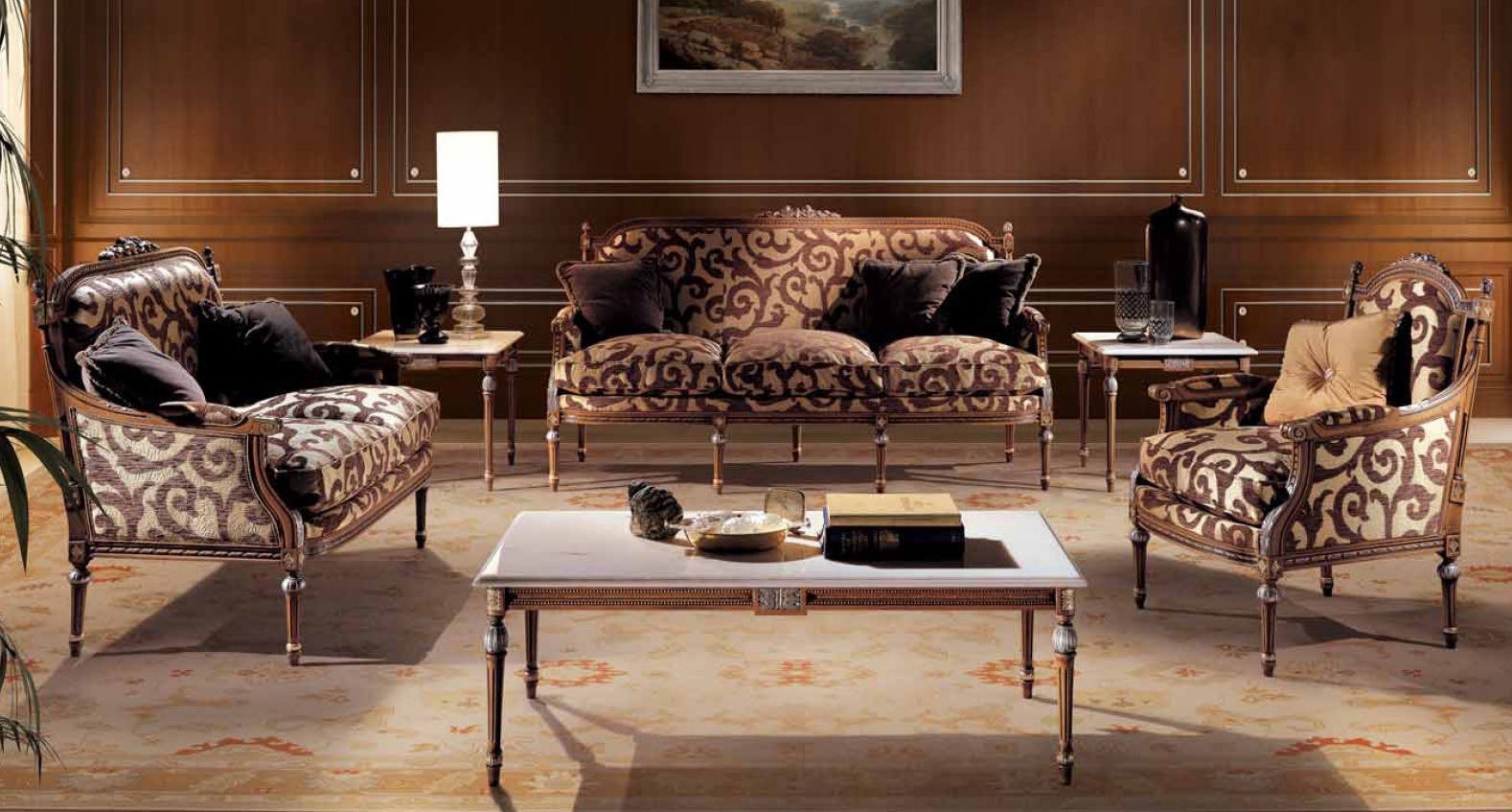 Melville set for the living room from Italian manufacturer Angelo Cappellini. Set in a classic style consists of armchairs, coffee tables and sofas triple and double models. Sofas and chairs are made on a frame of wood. The seat cushion is removable. The upholstery is made of textile. Decoration are decorative cushions. Supplements set Central oval coffee tables coffee table and two small tables predivnih round shape. Marble countertops are supported by carved frame from wood.