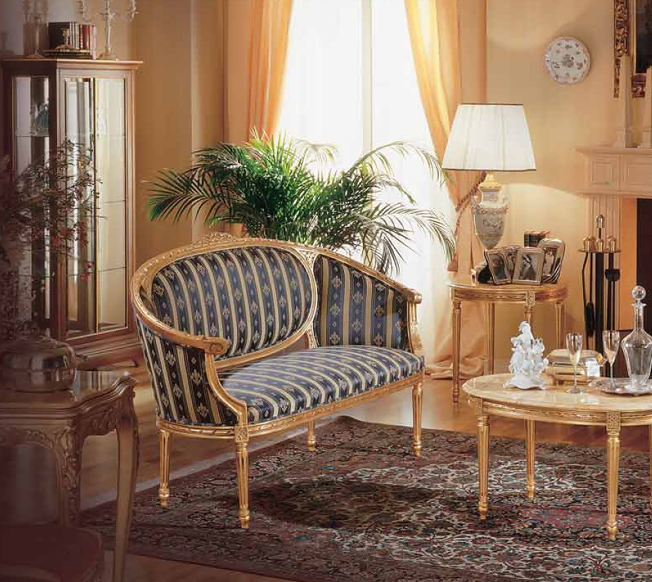 Voltaire sofa from Italian manufacturer Angelo Cappellini. Model with oval backrest and elbow-rests in the frame. The frame is made from wood and decorated with carved decoration. The upholstery is made of textiles from the assortment of the company. Perfect compact sofa for a small living room.