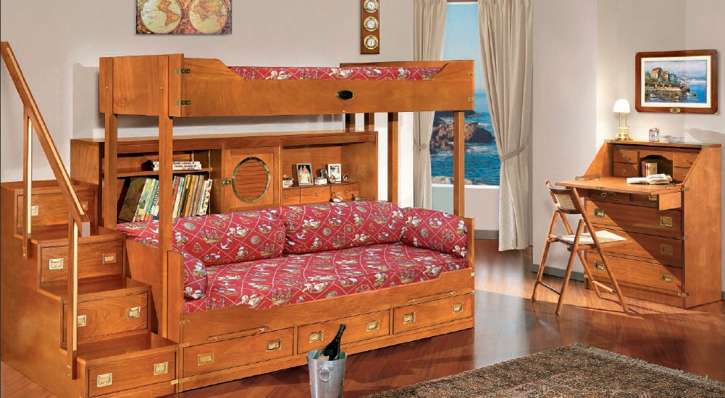 Children (Suite for children) Maria Vecchia, an Italian manufacturer of Caroti. Suite with bunk bed and sofa in one of the beds, provided a staircase with drawers. Complements the set of drawers with hinged lid. The furniture is made from natural red wood, the metal fittings with Golden finish. Design solution in a marine motif for a nursery.