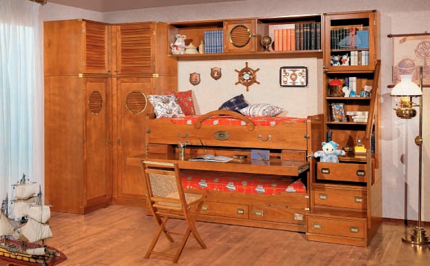 Baby set for the nursery with a bunk bed and built-in Desk Maria Vecchia, an Italian manufacturer of Caroti. Submitted by: adjustable bunk bed, a wide pull-out Desk, cupboard and drawers, put forward from the staircase and bed. Furniture made of solid mahogany wood in natural tone. Ergonomic design in a nautical theme for your nursery room.