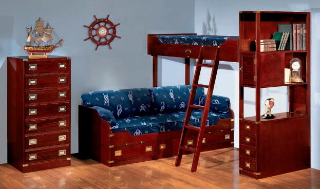 Baby set for the nursery mahogany Maria Vecchia Italian manufacturer Caroti. Presented bunk bed with insulated bunks with ladder, dresser with drawers and shelving, cabinetry. Design solution in a marine motif for a nursery.