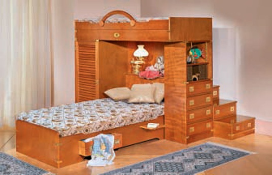 Children (set for children) with bunk bed Maria Vecchia Italian manufacturer Caroti. Presented bunk bed with insulated beds and ladder, wardrobe with 1 shutter-shutters and shelf with drawers, natural finish mahogany. The design for the classic children's room.