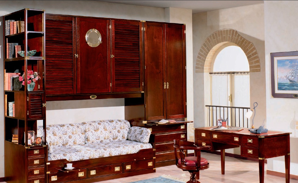 Children (set for children) with a Desk Maria Vecchia, an Italian manufacturer of Caroti. Set is made of mahogany, upholstery of sofa textiles, colors to be selected from the range of the factory. The presented models multifunctional wardrobe, writing table with 5 drawers, chairs with leather upholstery and sofa beds. Great for teenage room interior in classic style.