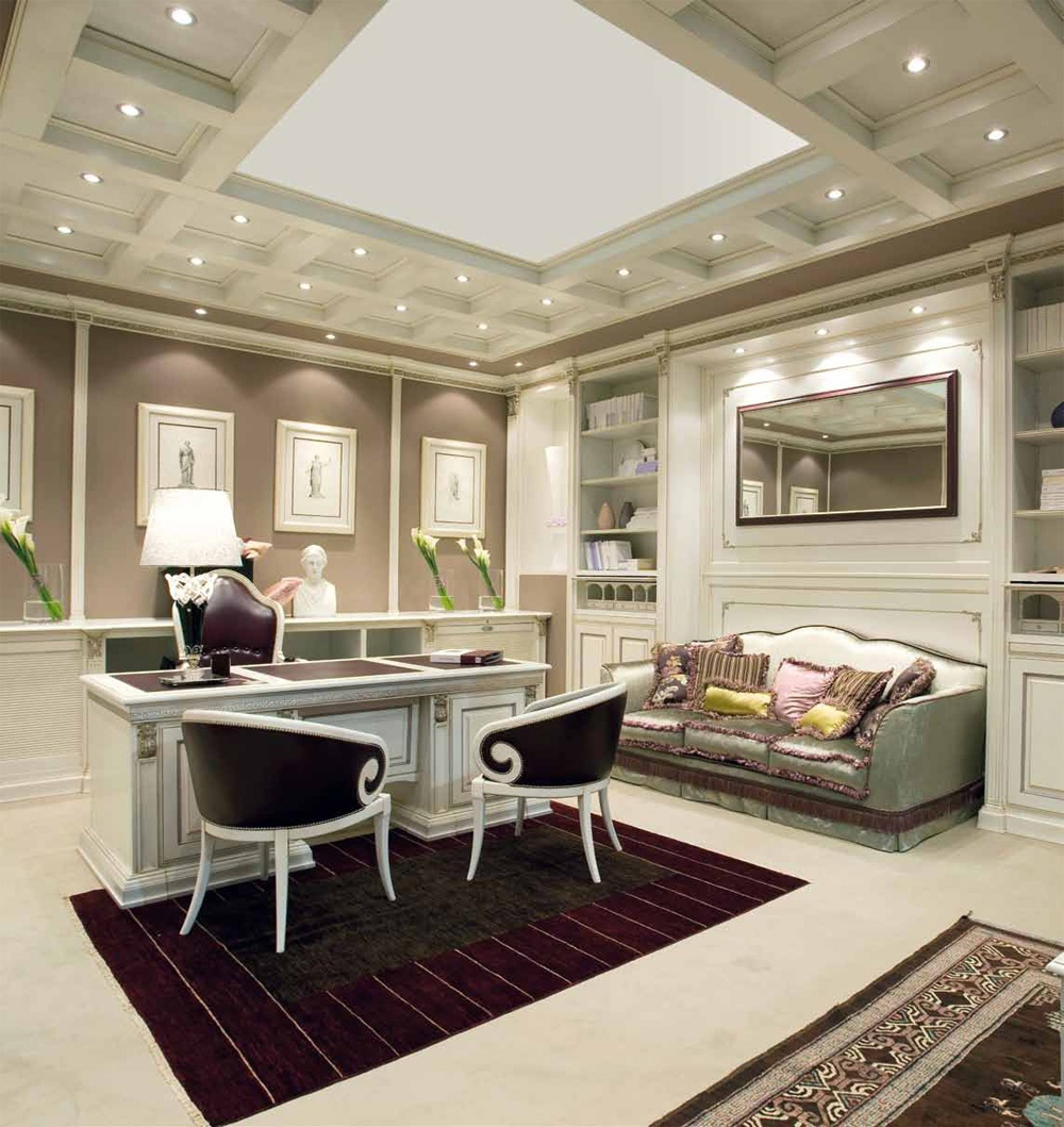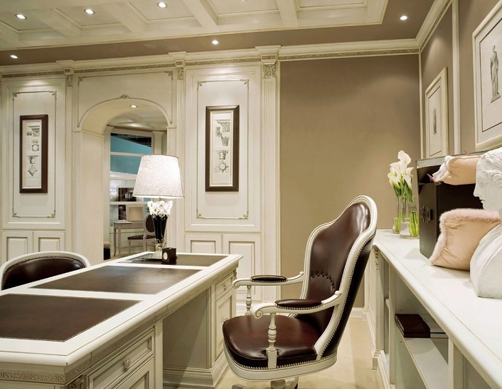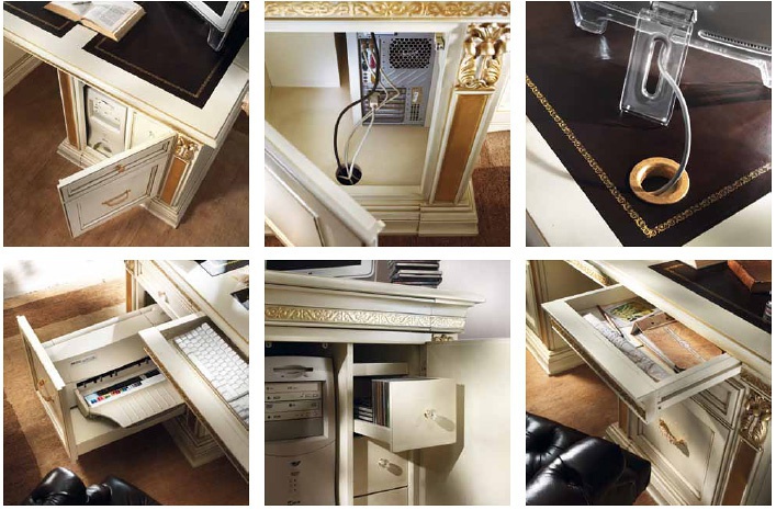 Headsets for office Geneve from the Italian manufacturer Epocart. Includes writing Desk, armchairs, modular system and three seater sofa. Frames models made of wood. The finish is offered in Matt lacquered white. Chairs are covered with skin. Sofa in fabric. The seat cushion is removable. Filler - polyurethane foam. The modular system is supplemented with a built-in backlight. The ornament serves as a decorative thread.