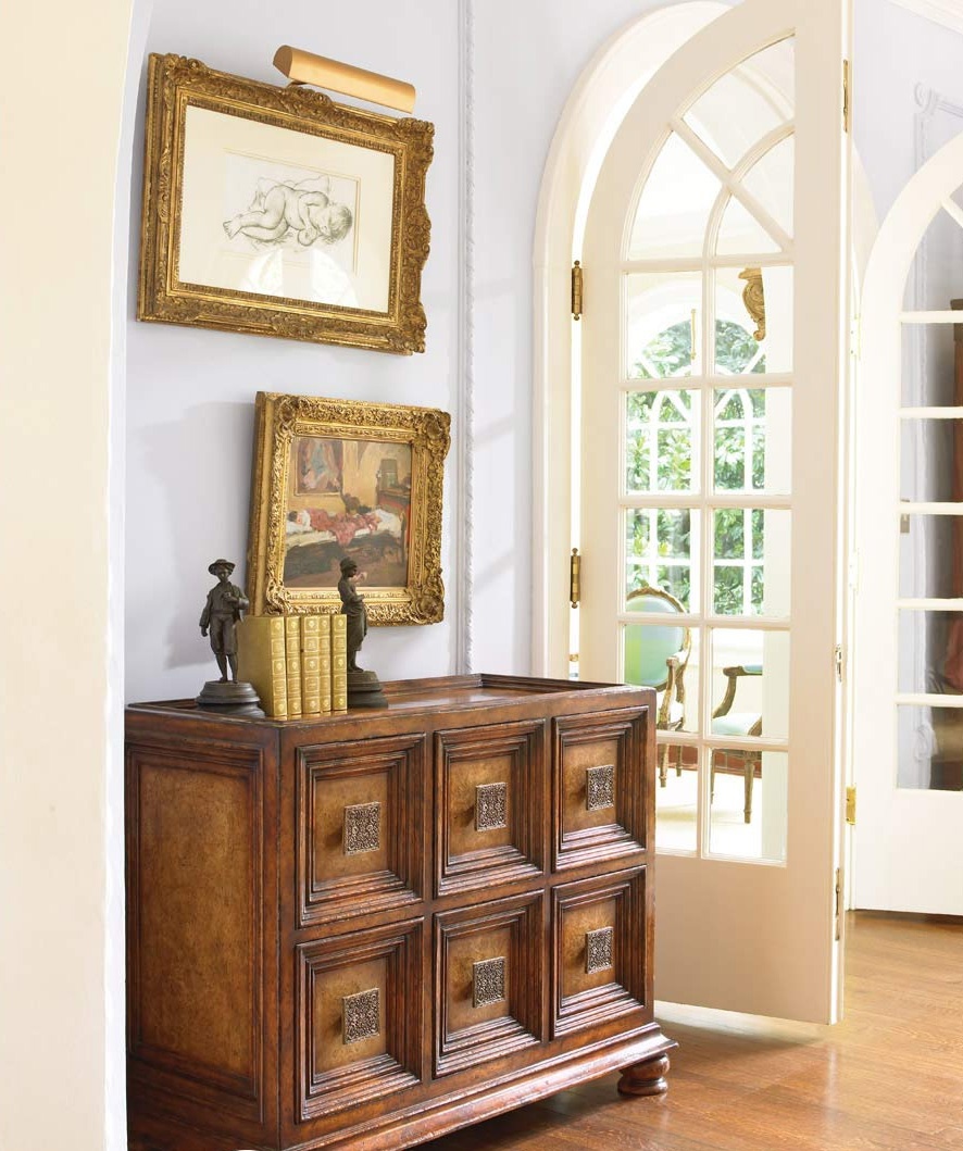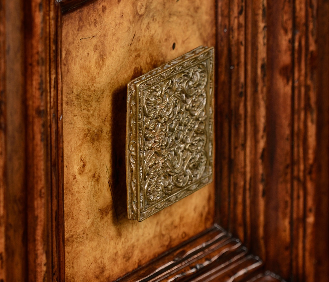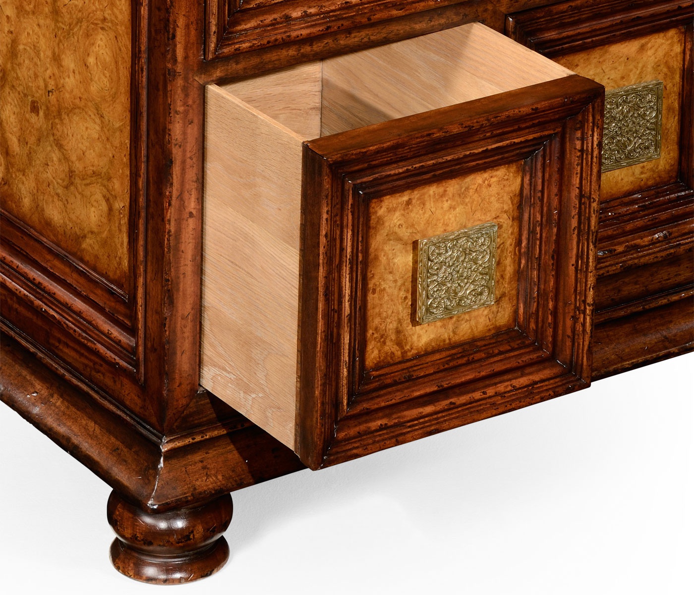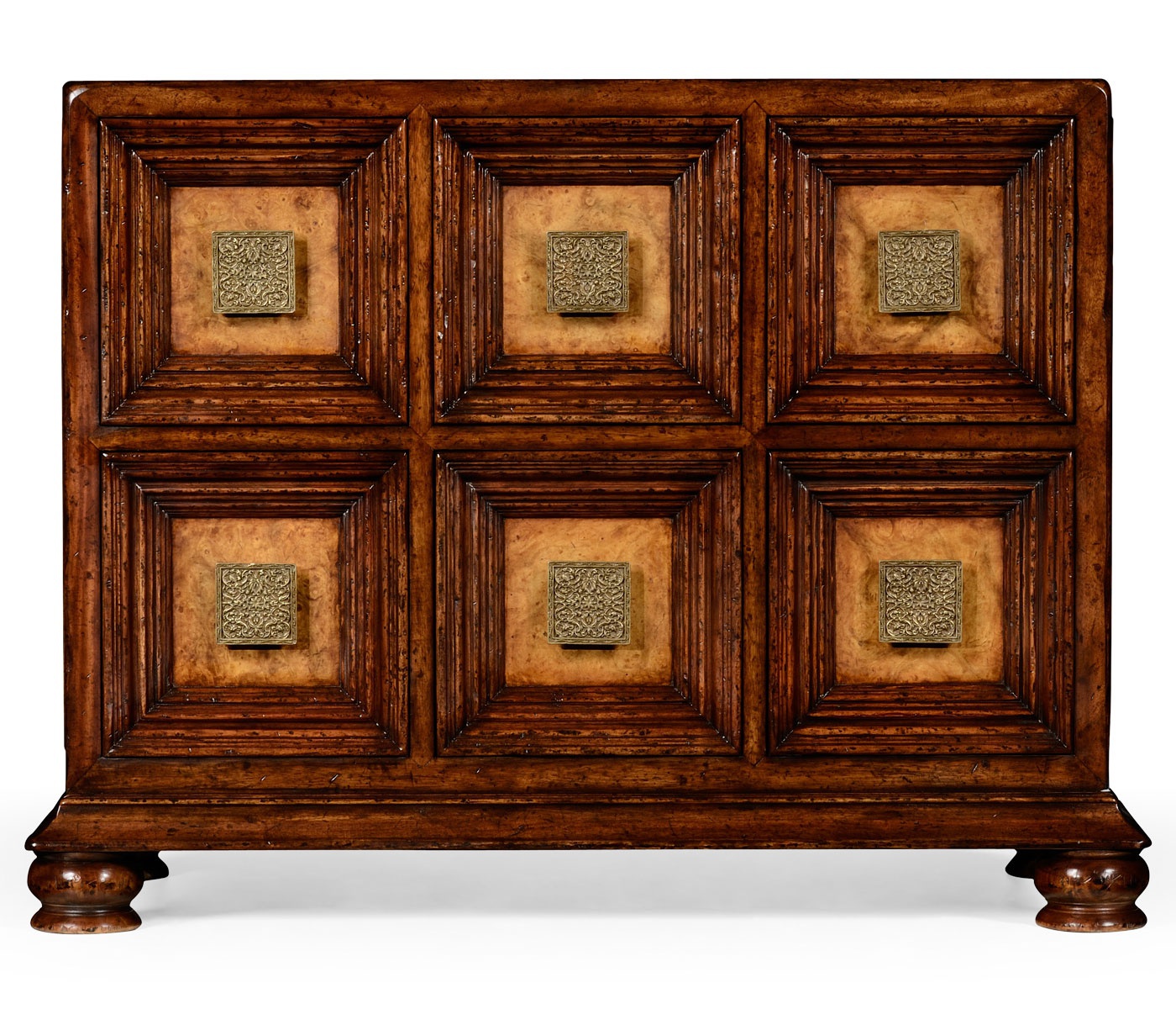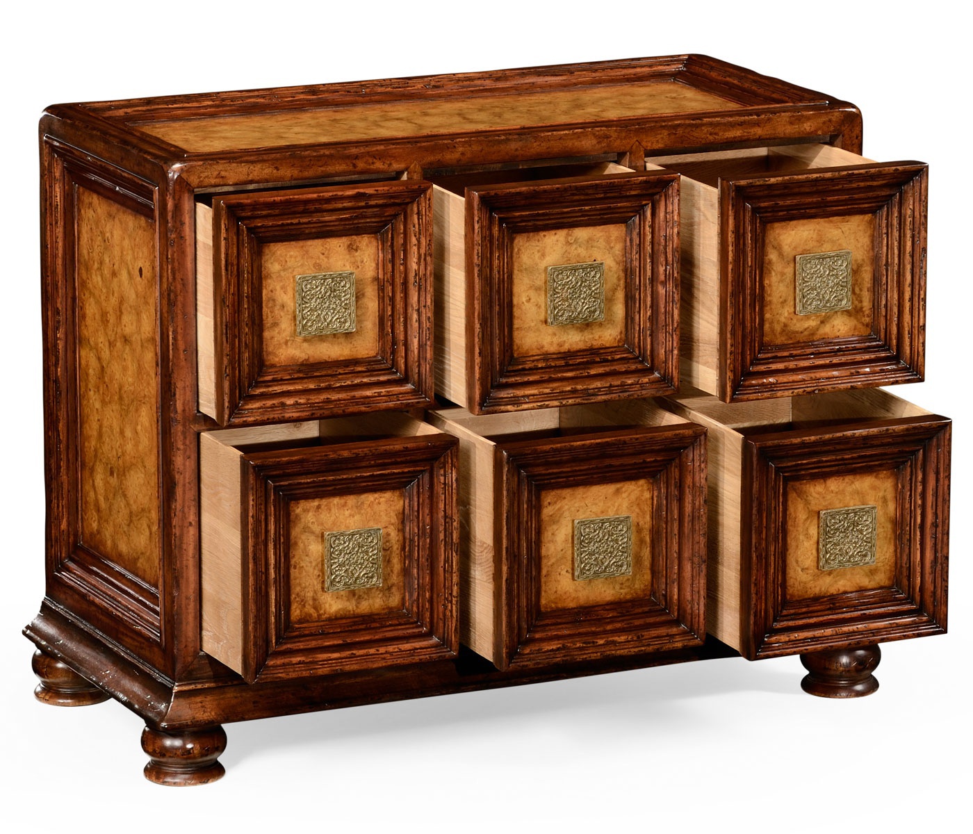 The Moroccan chest of drawers from the American manufacturer Jonathan Charles. The case is made of natural wood with the effect of aging. Square cast handle made of patinated brass. The model with six drawers square shape.