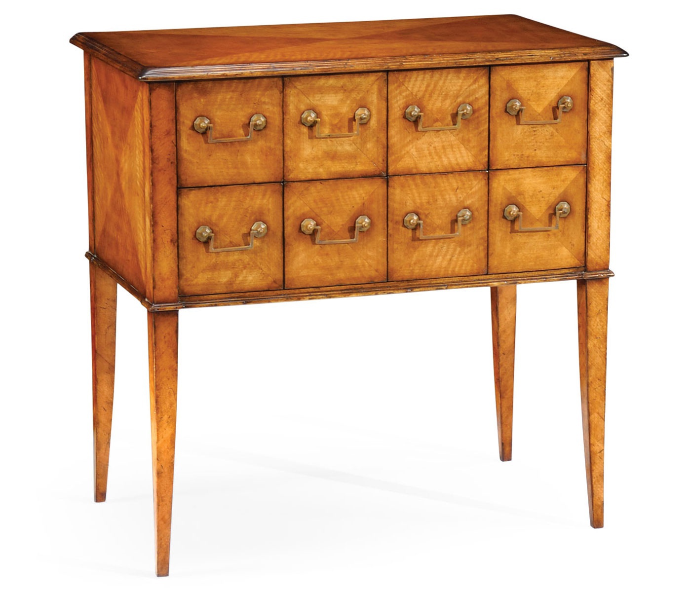 The Portobello chest of drawers from the American manufacturer Jonathan Charles. The case is made of natural wood and veneered satin wood, forming the geometrical pattern. Handles made of brass. Model on legs with eight drawers.