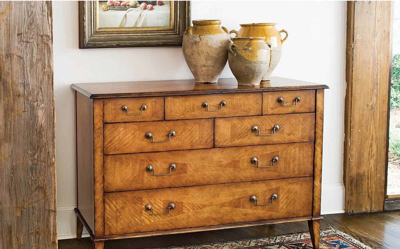 The Portobello chest of drawers from the American manufacturer Jonathan Charles. Model on legs with drawers of different proportions. The case is made of natural wood and veneered, thus forming the geometrical pattern. Handle made of patinated brass.
