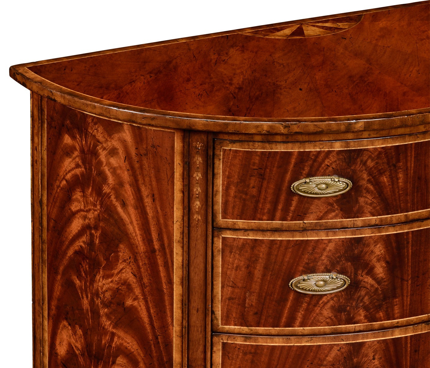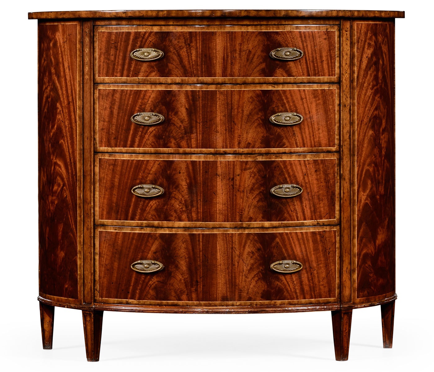 The Buckingham chest of drawers from the American manufacturer Jonathan Charles. Bedside model on legs with four drawers. The case is made of natural wood and veneered mahogany. The tabletop is in the shape of a Crescent decorated with marquetry. Oval handle made of patinated brass.