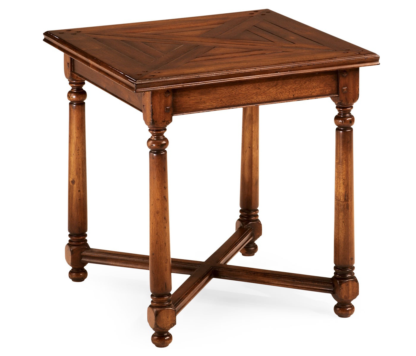 Table Country Farmhouse from the American manufacturer Jonathan Charles. The table top is made of the floorboard and slightly aged. Top supported by baluster. Small square table for magazines or coffee in country style.