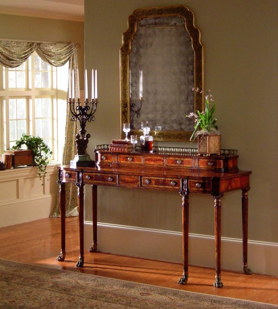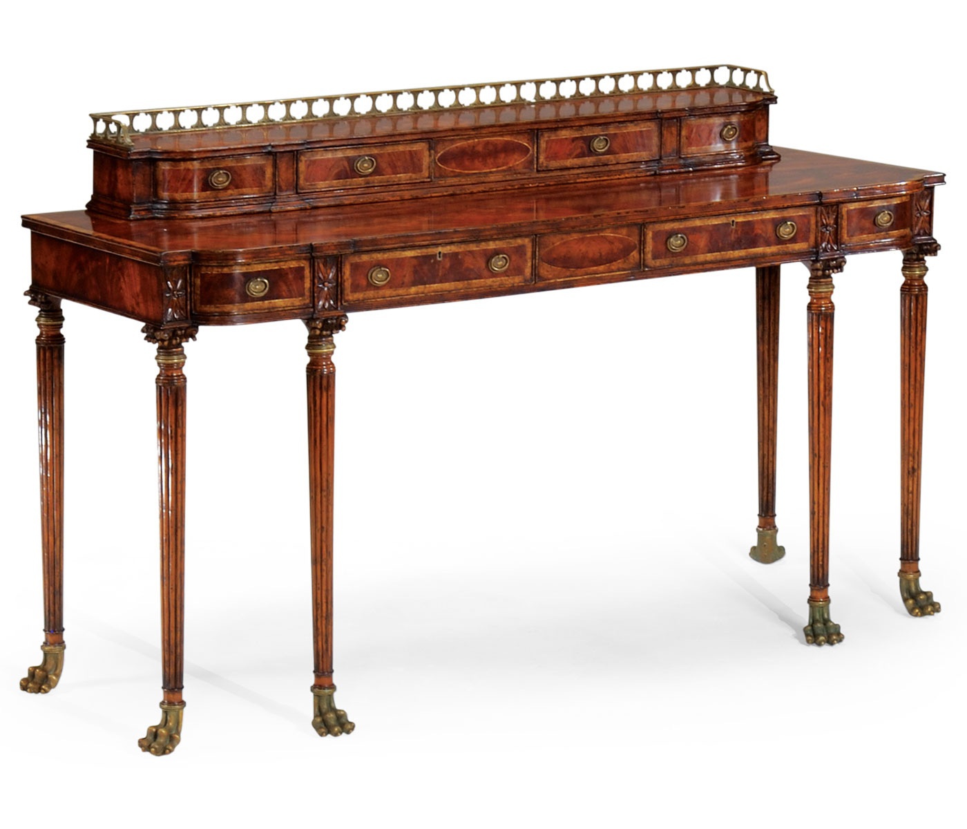 Buckingham console from an American manufacturer Jonathan Charles. A model with recessed upper part fitted with drawers. The case is made from natural wood and finished with rich mahogany. High fluted legs with brass tips in the form of paws of lion. The design is executed in classical style.