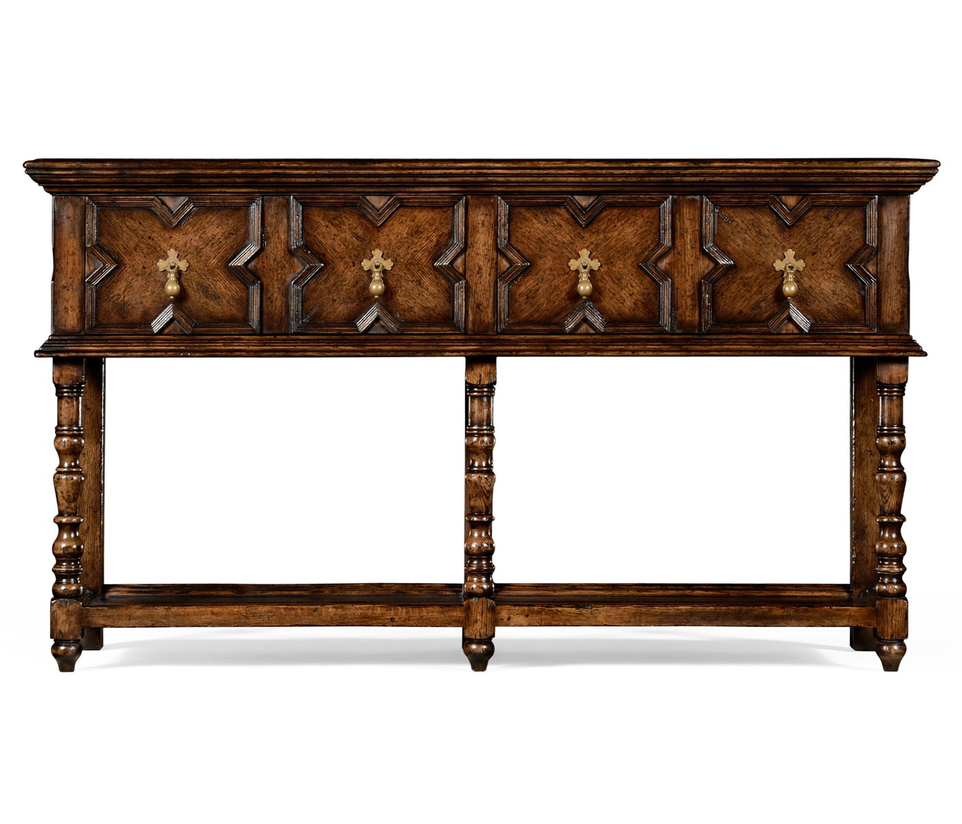 Kitchen table with effect of aging of Tudor Oak from the American manufacturer Jonathan Charles. The body is made from wood and finished in oak veneer. Model with effect of aging of fitted wooden shelf and drawers. Handle made of patinated brass.