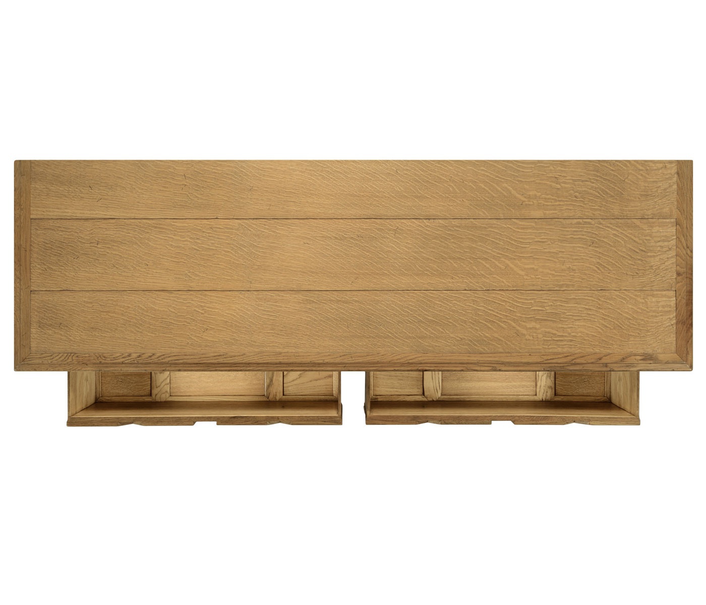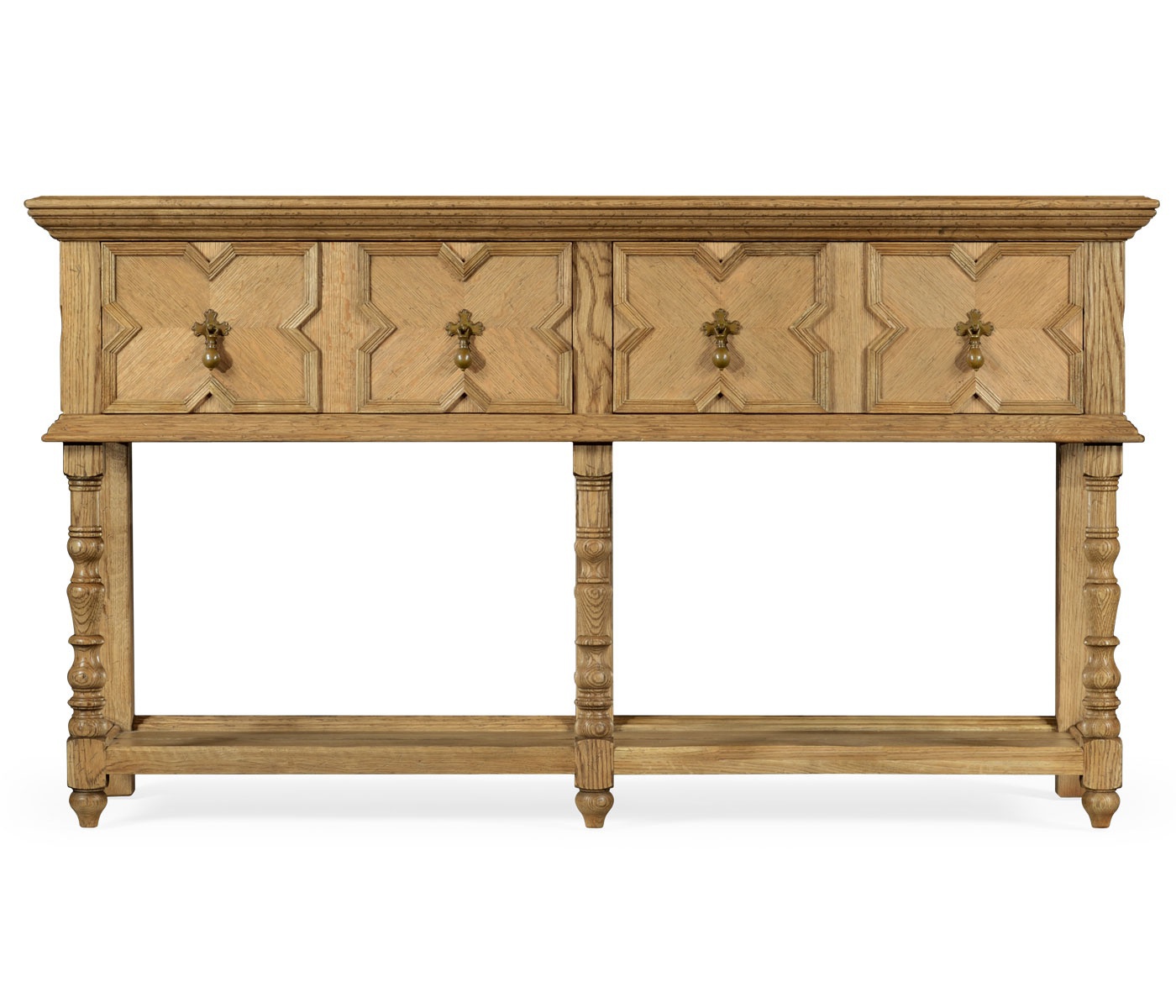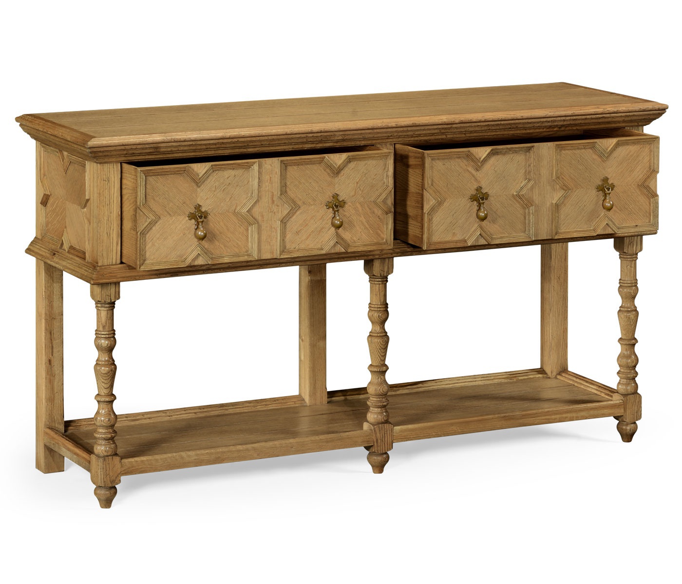 Kitchen table Natural Oak from the American manufacturer Jonathan Charles. The body is made of wood and finished with veneer. Model with effect of aging of fitted wooden shelf and drawers. The accessories are made from patinated brass.