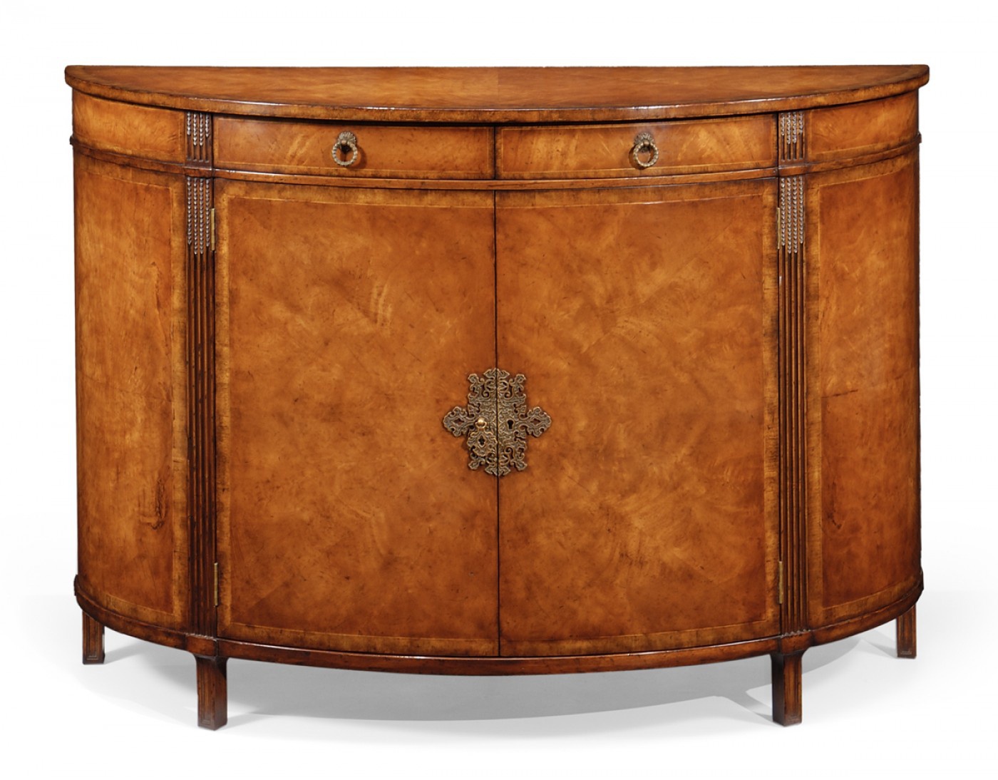 Buffet Windsor from the American manufacturer Jonathan Charles. Model of the semicircular form with two doors and drawers. The shelves inside are adjustable in height. The body is made of wood and finished with veneer. The accessories are made from patinated brass.