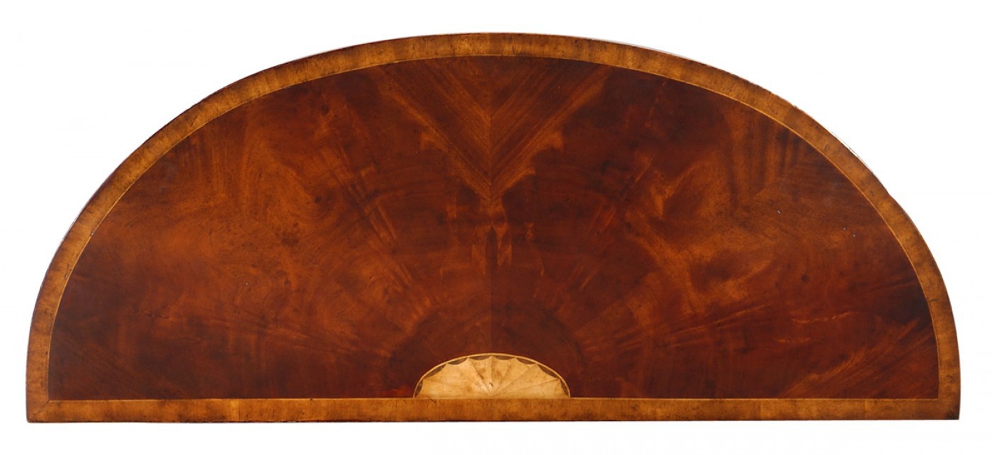 Buckingham buffet from an American manufacturer Jonathan Charles. The model on three legs with curved doors and three drawers at the top. The case is made of natural wood and veneered mahogany. Worktop and door panels decorated with marquetry. Fittings made of patinated brass.