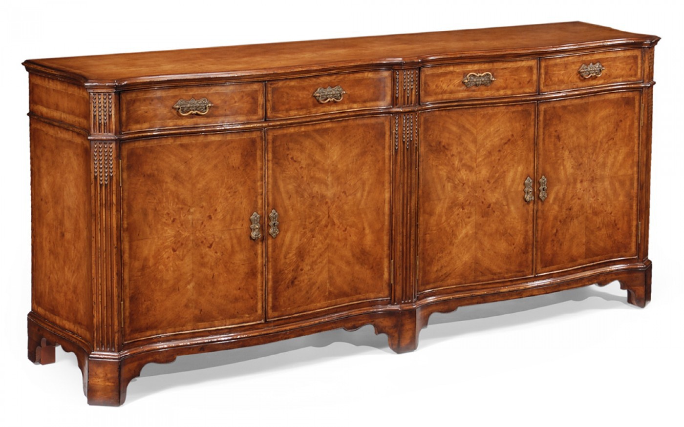 Buffet Windsor from the American manufacturer Jonathan Charles. Model on legs with four doors and drawers. The table-top is wavy, the corners are bevelled and decorated with carved columns. The body is made of wood and veneered walnut. Fittings made of patinated brass.