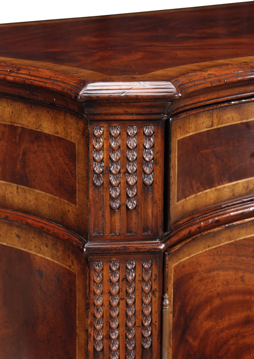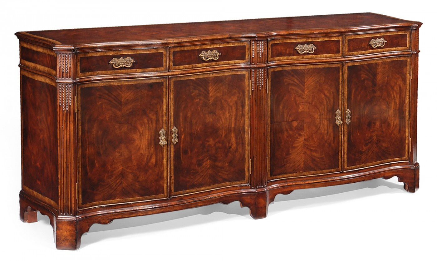 Buckingham buffet from an American manufacturer Jonathan Charles. Model on legs with curved doors and drawers. The corners are beveled and decorated with carvings. The case is made of natural wood and veneered mahogany. Fittings made of patinated brass.